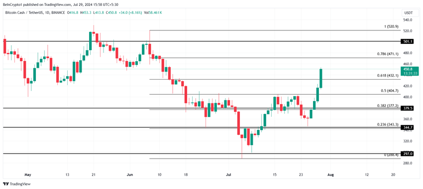 ราคาของ Bitcoin Cash เพิ่มขึ้น 25% ในช่วงสี่วันที่ผ่านมา และปัจจุบันซื้อขายที่ 450 ดอลลาร์ altcoin ใกล้จะทะลุเส้น Fib 78.6% ซึ่งทําหน้าที่เป็นแนวต้านที่ 471 ดอลลาร์ อย่างไรก็ตาม ปัจจัยดังกล่าวจะหยุดชะงักได้