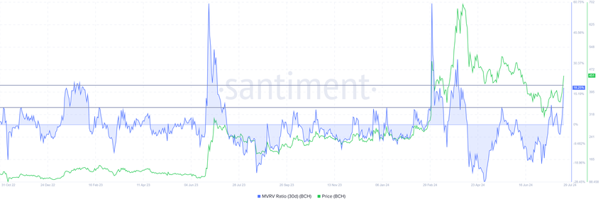 อัตราส่วนมูลค่าตลาดต่อมูลค่าที่รับรู้ (MVRV) สนับสนุนทฤษฎีนี้ อัตราส่วน MVRV ประเมินกําไรและขาดทุนของนักลงทุน ปัจจุบัน MVRV 30 วันของ Bitcoin Cash อยู่ที่ 18% ซึ่งบ่งชี้ถึงความสามารถในการทํากําไรและแรงกดดันในการขายที่อาจเกิดขึ้น