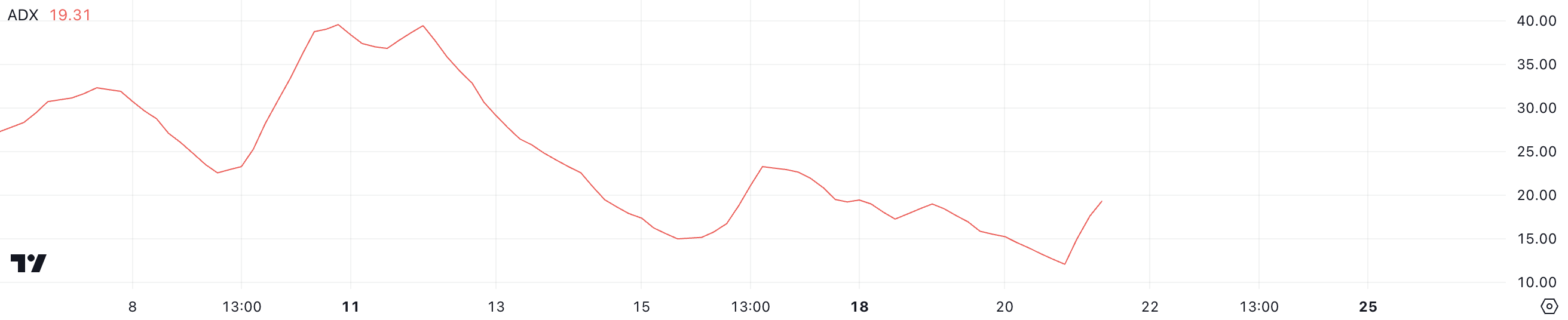 อย่างไรก็ตาม เนื่องจาก ADX ยังคงต่ำกว่า 25 จึงบ่งชี้ว่าแนวโน้มขาขึ้นยังไม่ถึงระดับที่แข็งแกร่งหรือยั่งยืน