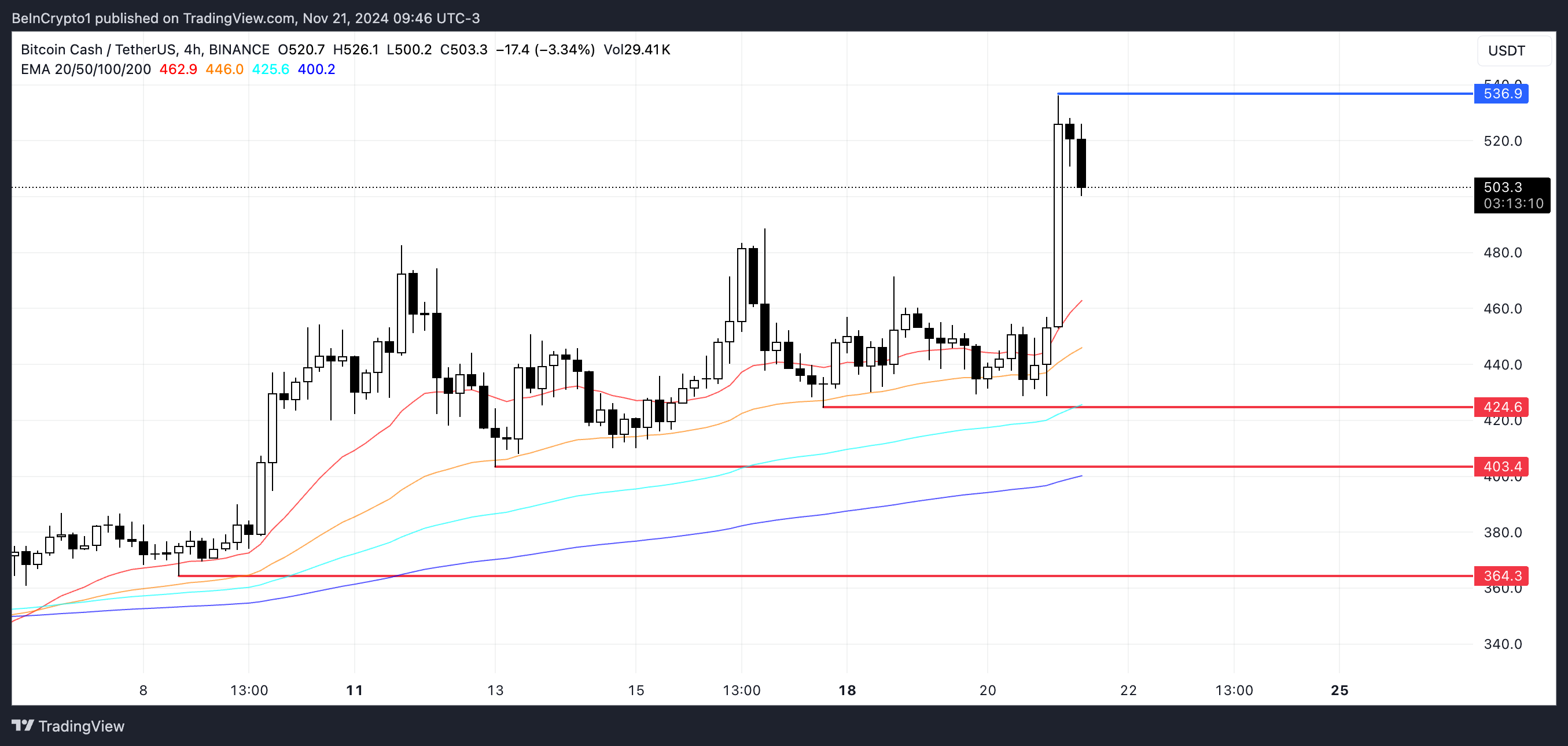 ความแข็งแกร่งนี้อาจผลักดัน ราคาของ BCH ให้ทดสอบแนวต้านที่ 536.9 USD การทะลุระดับนี้จะส่งสัญญาณถึงการต่อเนื่องของแรงขาขึ้นและอาจดึงดูดความสนใจในการซื้อเพิ่มเติม
