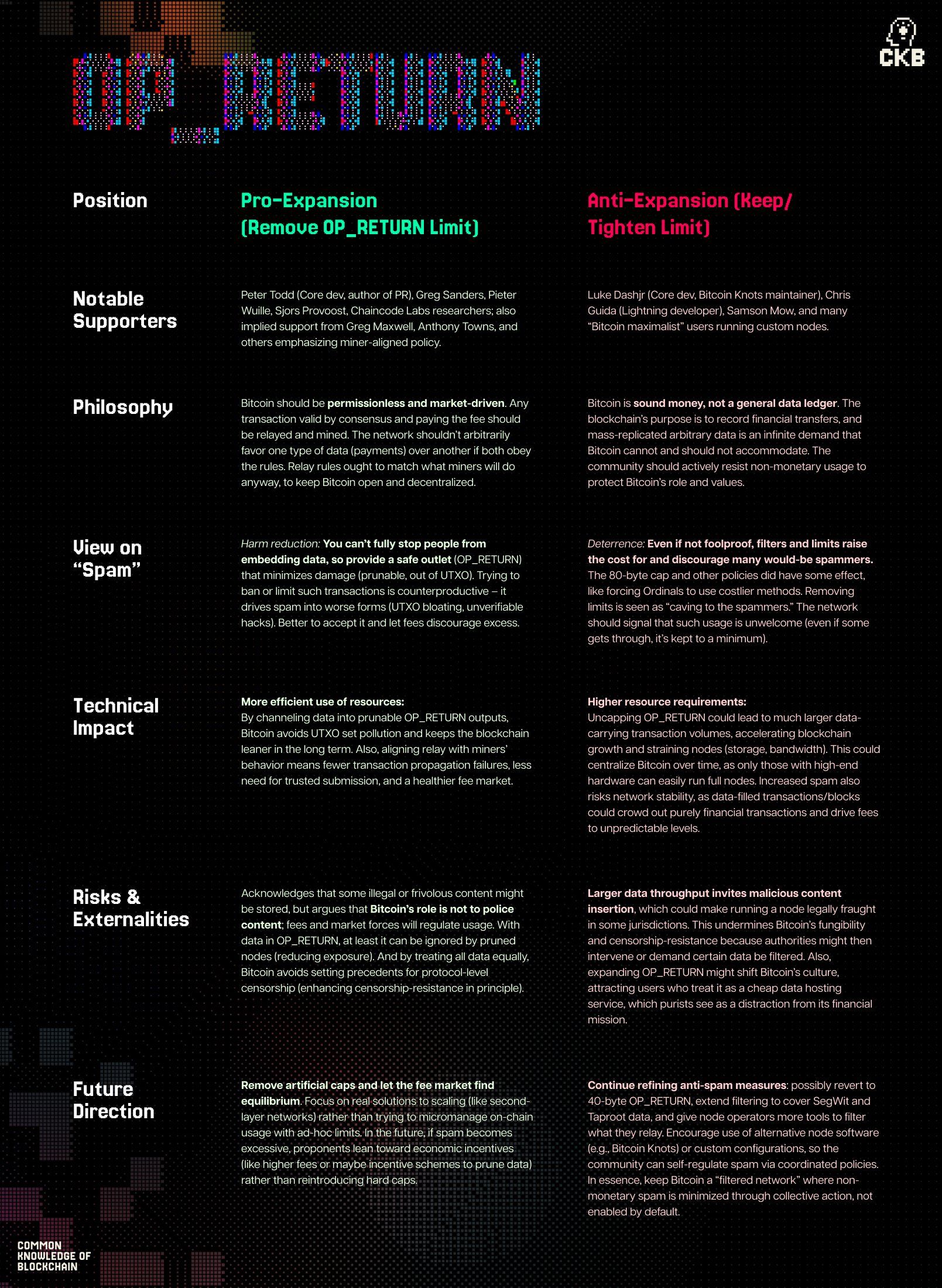 ผู้สนับสนุนการขยาย OP_RETURN โต้แย้งว่าความกลัวเรื่องการบวมและสแปมเกินจริง พวกเขาเสนอว่า ด้วยตลาดค่าธรรมเนียมและกลไกการกรองที่เหมาะสม Bitcoin สามารถรักษาความปลอดภัยได้ในขณะที่เปิดใช้งานกรณีการใช้งานที่กว้างขึ้น