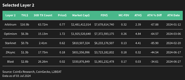 Ethereum รักษาเสถียรภาพในช่วงกลางท่ามกลางความคาดหวังที่เพิ่มขึ้นสำหรับการอนุมัติ ETF ซึ่งคาดว่าจะเริ่มการซื้อขายในต้นเดือนกรกฎาคม อย่างไรก็ตามกิจกรรม On-chain ก็ลดลงในเดือนนี้เช่นกันโดยค่าธรรมเนียมก๊าซลดลงอย่างมาก การเปิดตัวโทเค็นของโซลูชัน layer 2 ที่โดดเด่น เช่น ZKSync และ Blast เน้นย้ำถึงความพยายามในการขยายขนาด (Scalability) อย่างต่อเนื่องของEthereum แม้ว่าจะทำให้เกิดความกังวลภายในชุมชนเกี่ยวกับความแตกต่างของการประเมินมูลค่าและการเปลี่ยนแปลงของตลาดหลังกิจกรรมการสร้างโทเค็นหรือ TGE (Token Generation Event)