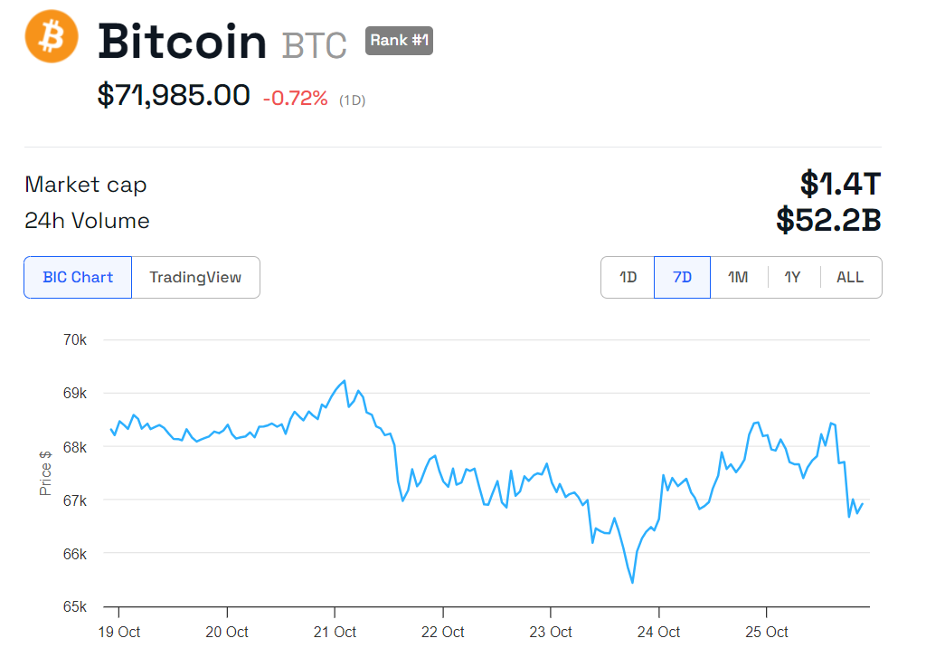 บิตคอยน์มีราคาอยู่รอบๆ 72,000 USD หลังจากที่ได้แตะ 73,500 USD เมื่อวานนี้ อย่างไรก็ตาม การขายที่รวดเร็วทำให้ไม่สามารถทำสถิติใหม่ได้
