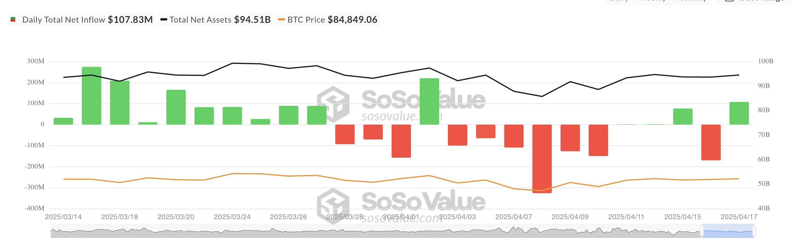 Bitcoin ETFs กลับมาเป็นบวกอีกครั้งในวันพฤหัสบดี โดยบันทึกการไหลเข้ามากกว่า 100 ล้าน USD หลังจากการไหลออกอย่างรวดเร็วในวันพุธที่ 169.87 ล้าน USD ซึ่งเป็นการถอยกลับเพียงวันเดียวของสัปดาห์นี้สำหรับ BTC ETFs