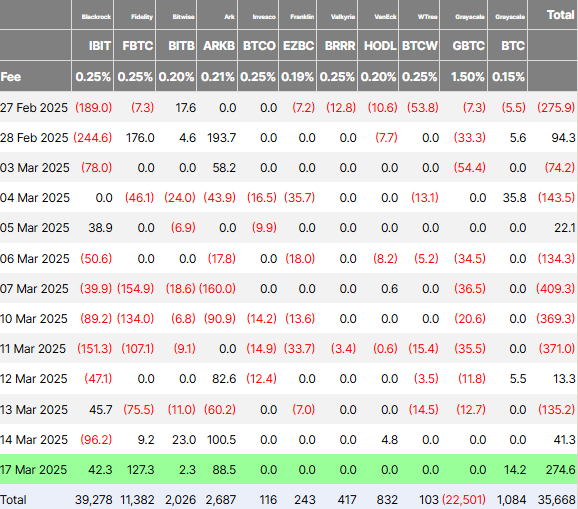 หลังจากหลายสัปดาห์ของการไหลออก กองทุนซื้อขายแลกเปลี่ยน Bitcoin (ETFs) ได้กลับทิศทาง โดยบันทึกการไหลเข้า 274.6 ล้าน USD ในวันที่ 17 มีนาคม
