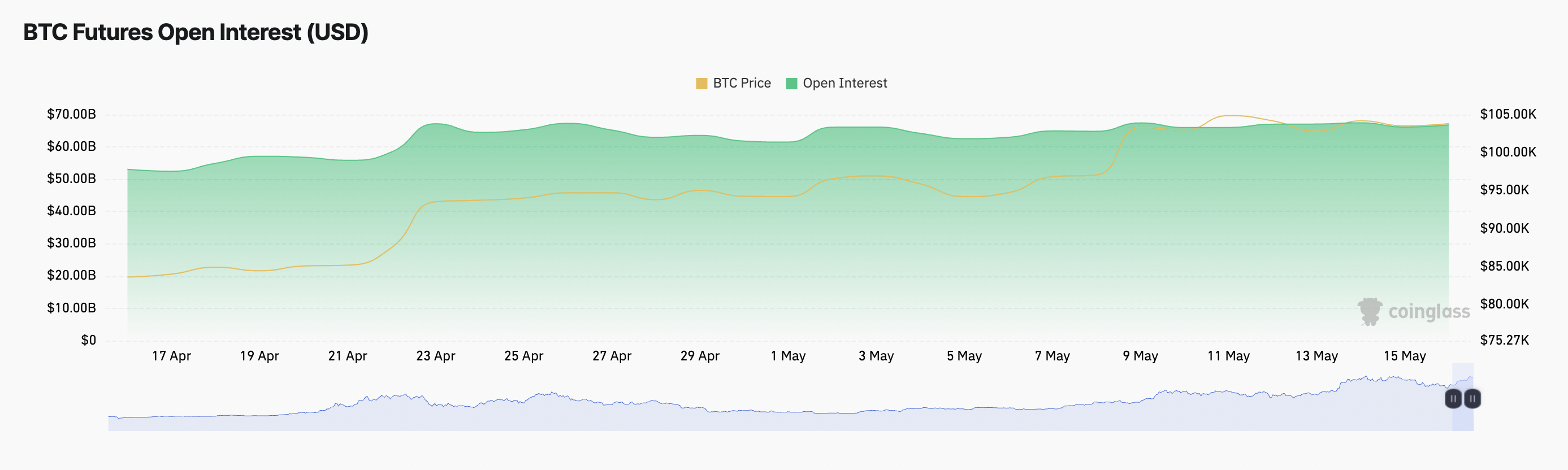 ณ เวลาที่เขียนบทความนี้ coin ชั้นนำมีการซื้อขาย ที่ 104,007 USD โดยมีการเพิ่มขึ้นของราคาถึง 2% ท่ามกลางการฟื้นตัวของตลาดในวันก่อนหน้า ในช่วงเวลาที่ตรวจสอบ open interest (OI) ของ futures ของ coin นี้ได้เพิ่มขึ้นเล็กน้อย 1% ซึ่งบ่งบอกถึงการเพิ่มขึ้นเล็กน้อยในตำแหน่งที่มีการใช้เลเวอเรจ