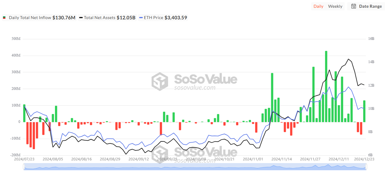 น่าสนใจที่ในขณะที่เงินไหลออกจาก Bitcoin ETFs แต่ Ethereum ETFs กลับมีเงินไหลเข้าในช่วงการซื้อขายวันที่ 23 ธันวาคม ในขณะที่ Bitcoin ETFs มีเงินไหลออกถึง 226 ล้าน USD แต่ Ethereum ETFs ดึงดูดเงินไหลเข้ามากกว่า 130 ล้าน USD นอกจากนี้ Ethereum ETF ของ BlackRock ตอนนี้ถือครอง ETH มากกว่า 1,000,000 เหรียญ