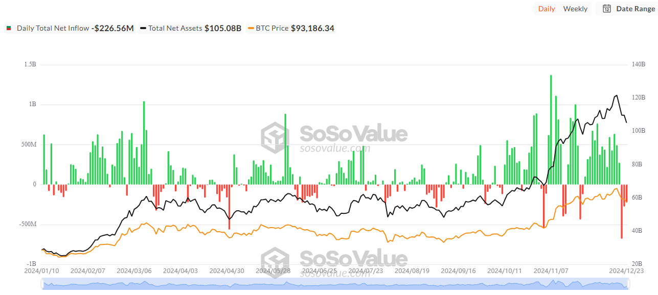 ข้อมูลจาก SoSoValue ระบุว่า Bitcoin ETF ประสบการไหลออกเกือบ 1.2 พันล้าน USD ในสามวันทำการที่ผ่านมา โดยเฉพาะวันที่ 19 ธันวาคมมีการไหลออกถึง 680 ล้าน USD ซึ่งเป็นการไหลออกในวันเดียวสูงสุดตั้งแต่ Bitcoin ETF ได้รับการอนุมัติ