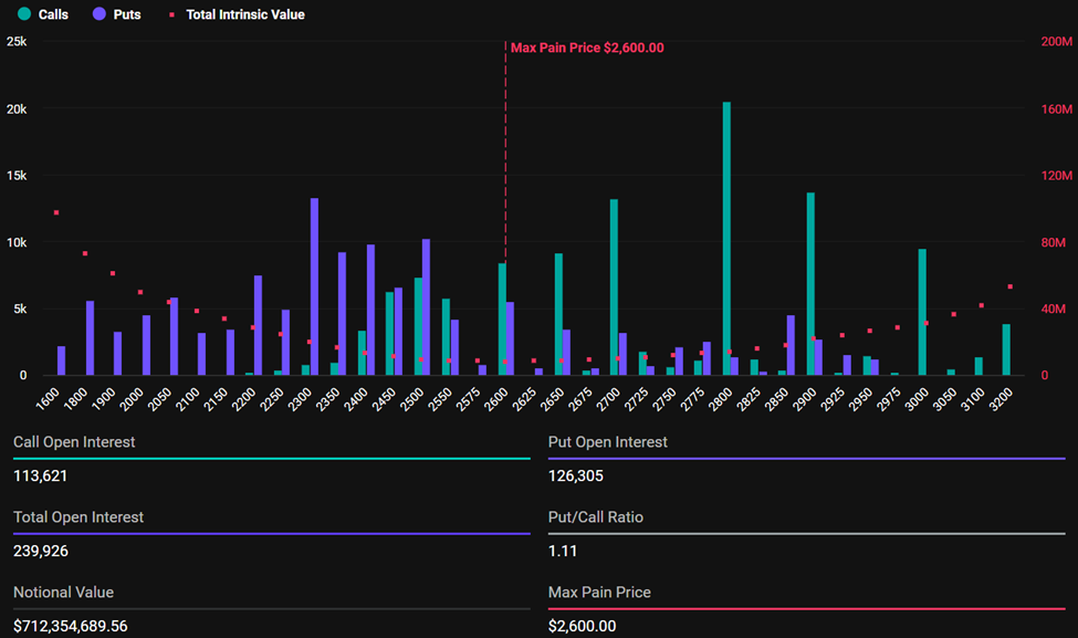 เช่นเดียวกับ Bitcoin ออปชั่น Ethereum ที่หมดอายุในวันนี้มีอัตราส่วน Put-to-Call สูงกว่า 1 โดยข้อมูลจาก Deribit แสดงให้เห็นว่าอยู่ที่ 1.11 ในขณะที่เขียนนี้ ในขณะเดียวกัน ระดับความเจ็บปวดสูงสุด หรือราคาตีคือ 2,600 USD
