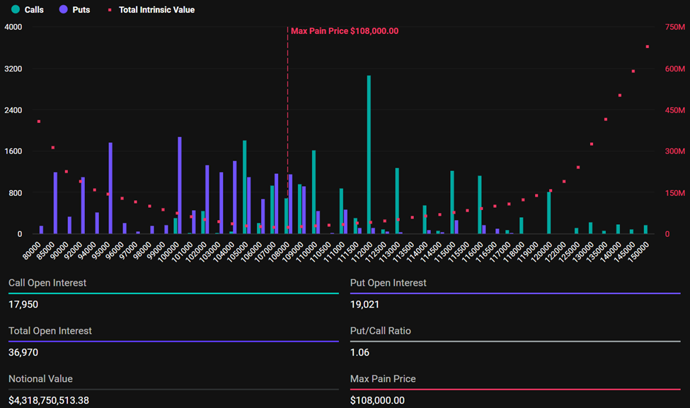 ด้วยอัตราส่วน Put-to-Call ที่ 1.06 ระดับความเจ็บปวดสูงสุดสำหรับออปชั่น Bitcoin ที่หมดอายุในวันนี้คือ 108,000 USD