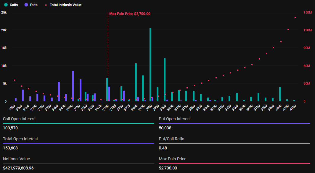 ในทางกลับกัน Ethereum มีสัญญา 153,608 ฉบับที่มีมูลค่าตามสัญญา 421.97 ล้านดอลลาร์ สัญญาที่หมดอายุเหล่านี้มีอัตราส่วน put to call ที่ 0.48 และจุดเจ็บปวดสูงสุดที่ 2,700 ดอลลาร์