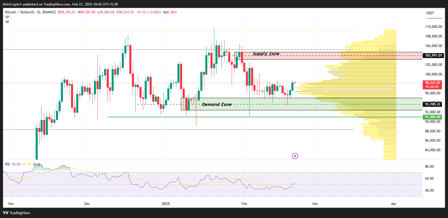 Bitcoin ซื้อขายอยู่ที่ประมาณ 98,243 ดอลลาร์ ลอยอยู่เหนือโซนความต้องการที่สำคัญระหว่าง 93,700 ดอลลาร์ และ 91,000 ดอลลาร์ พื้นที่นี้เคยทำหน้าที่เป็นแนวรับที่แข็งแกร่งมาก่อน บ่งชี้ว่าผู้ซื้ออาจเข้ามาปกป้องระดับเหล่านี้