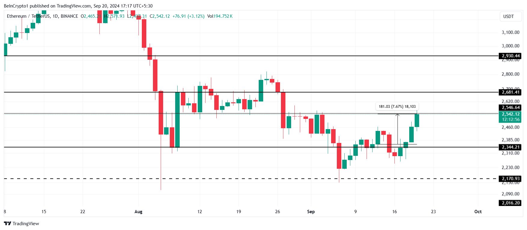 ราคาของ Ethereum ได้ เพิ่มขึ้น 7% ในสัปดาห์ที่ผ่านมา ปัจจุบันซื้อขายที่ 2,542 USD สกุลเงินดิจิทัลนี้อยู่เพียงแค่ต่ำกว่าระดับต้านสำคัญที่ 2,546 USD การทะลุผ่านอุปสรรคนี้อาจทำให้ราคาพุ่งไปที่ 2,681 USD ซึ่งจะเป็นการแสดงถึงการทะลุขึ้นในระยะสั้น