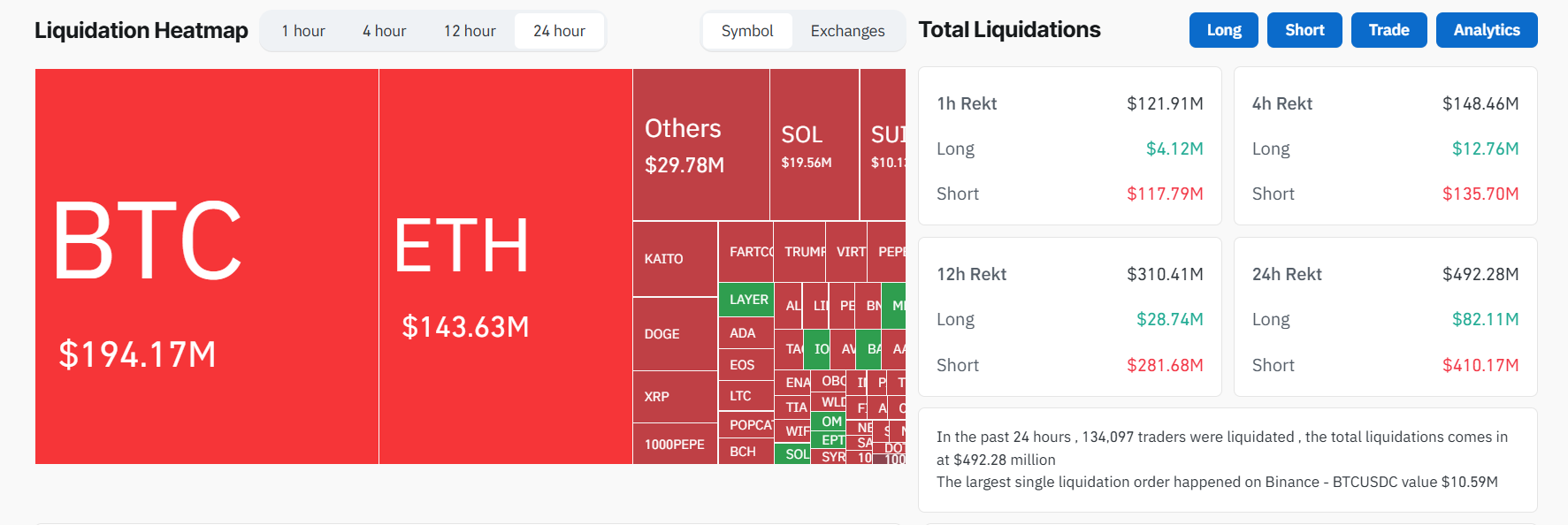 ความรู้สึกเสี่ยงที่เพิ่มขึ้นนี้ได้แพร่เข้าสู่ตลาดคริปโต โดยมีการชำระสถานะ short มากกว่า 492 ล้าน USD ในตลาดอนุพันธ์ในช่วง 24 ชั่วโมงที่ผ่านมา ตามข้อมูลจาก CoinGlass
