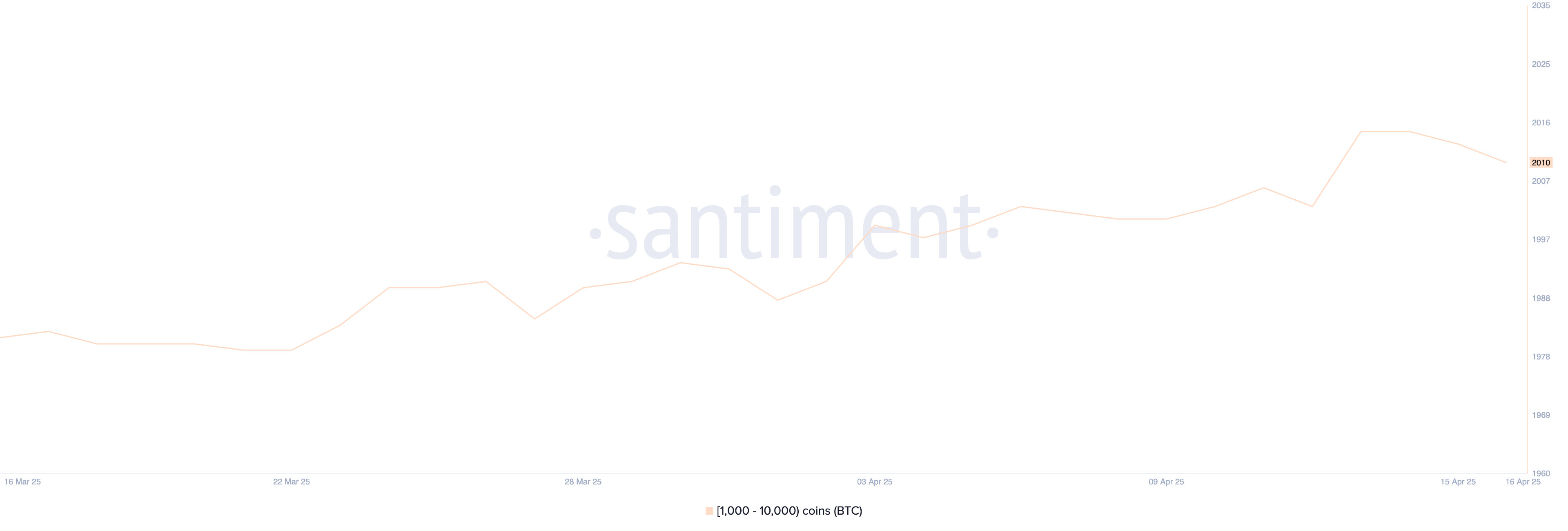 จำนวน วาฬบิทคอยน์—กระเป๋าเงินที่ถือระหว่าง 1,000 ถึง 10,000 BTC—ได้ลดลงเล็กน้อยในช่วงไม่กี่วันที่ผ่านมา ลดลงจาก 2,015 ในวันที่ 14 เมษายน เป็น 2,010 ภายในวันที่ 16 เมษายน
