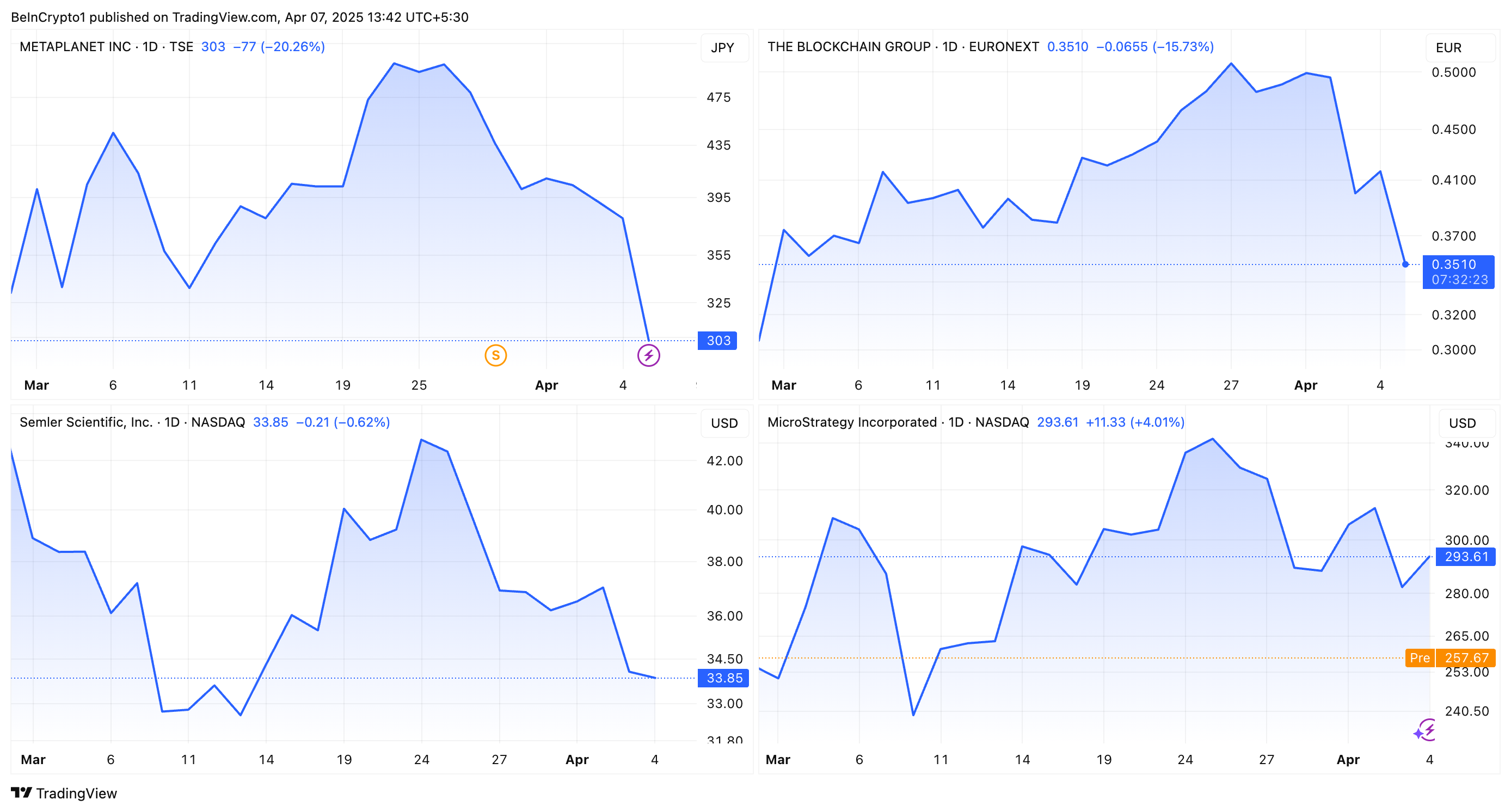 ในทำนองเดียวกัน พอร์ตโฟลิโอของ The Blockchain Group (ALTBG.PA) ลดลง 14.4% โดยถือครอง Bitcoin จำนวน 620 เหรียญ มูลค่า 46.39 ล้าน USD ต้นทุนเฉลี่ยต่อ Bitcoin ของบริษัทคือ 87,424 USD