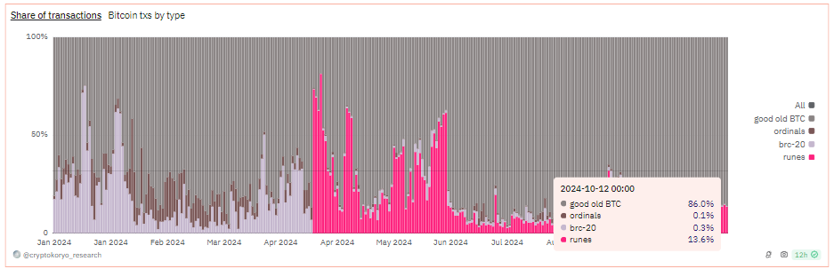 ข้อมูลจาก Dune Analytics แสดงว่าธุรกรรมของ Runes มีส่วนร่วมเฉลี่ยมากกว่า 15% ของธุรกรรมทั้งหมดในเครือข่าย Bitcoin ในสัปดาห์ที่ผ่านมา ในวันที่ 7 ตุลาคม ธุรกรรมที่เกี่ยวข้องกับ Runes คิดเป็น 19.4% ของธุรกรรม BTC ทั้งหมด แม้ว่าตัวเลขนี้จะลดลงเหลือ 10.7% ในวันที่ 9 ตุลาคม ก่อนที่จะกลับมาเพิ่มขึ้นเป็น 13.6% ในวันที่ 12 ตุลาคม