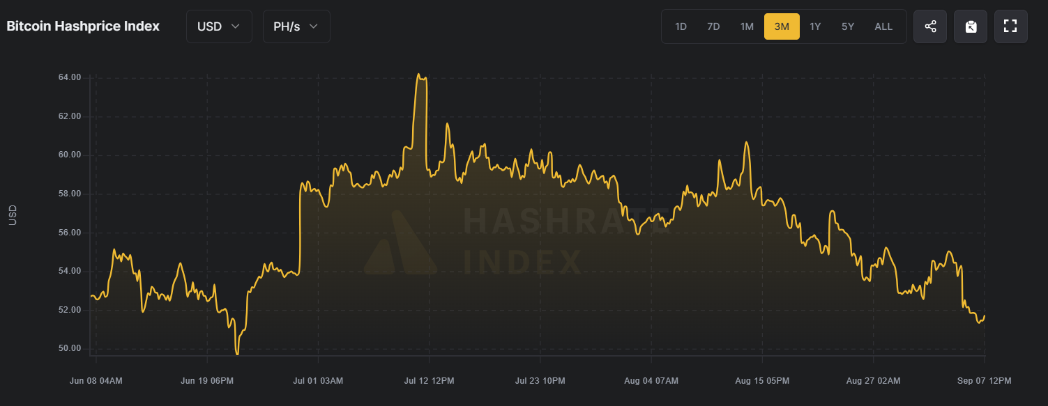 ข้อมูลจาก Hashrate Index แสดงให้เห็นว่า hashprice—เกณฑ์มาตรฐานสำหรับรายได้ของนักขุดต่อหน่วยกำลังการประมวลผล—ได้ลดลงเหลือประมาณ USD 51
