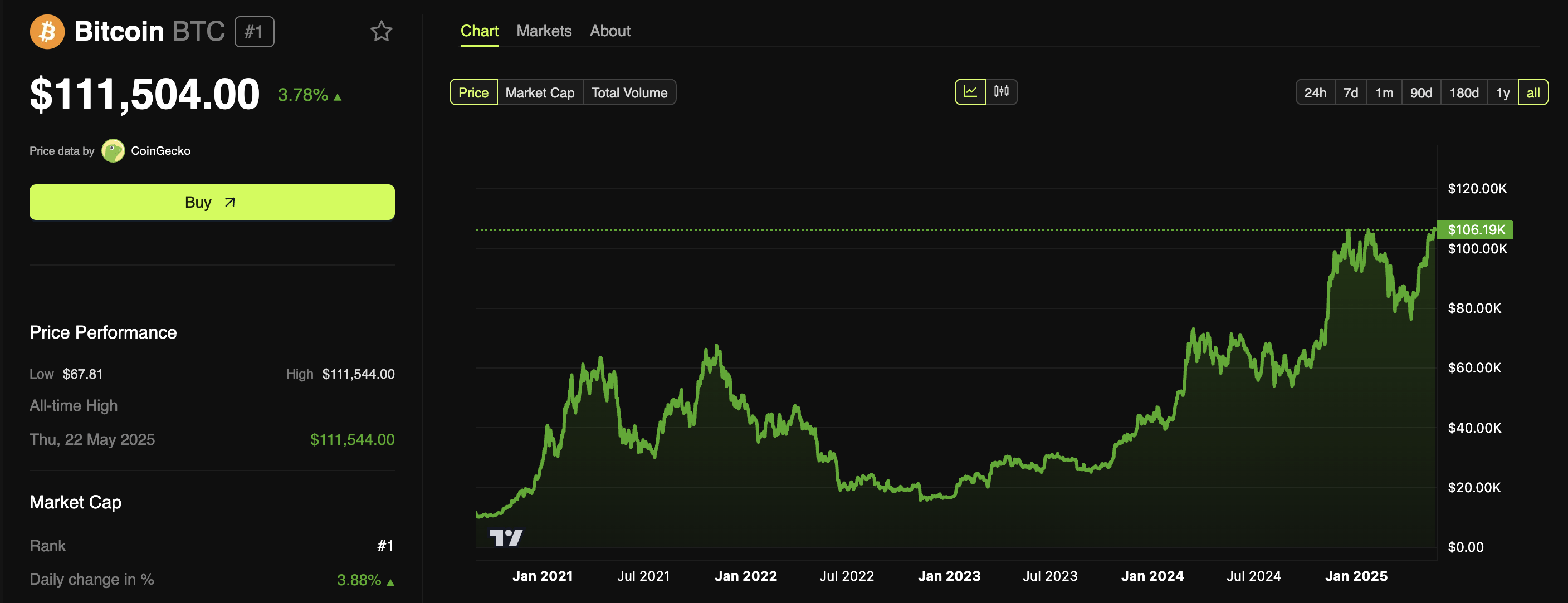 เพื่อเป็นการระลึกถึงการซื้อครั้งแรก การคำนวณว่าจำนวนพิซซ่าที่ 10,000 BTC สามารถซื้อได้เป็นสิ่งที่เหมาะสม ข้อมูลจาก BeInCrypto แสดงให้เห็นว่า ราคาซื้อขายของ BTC ในขณะนี้อยู่ที่ 111,504 USD