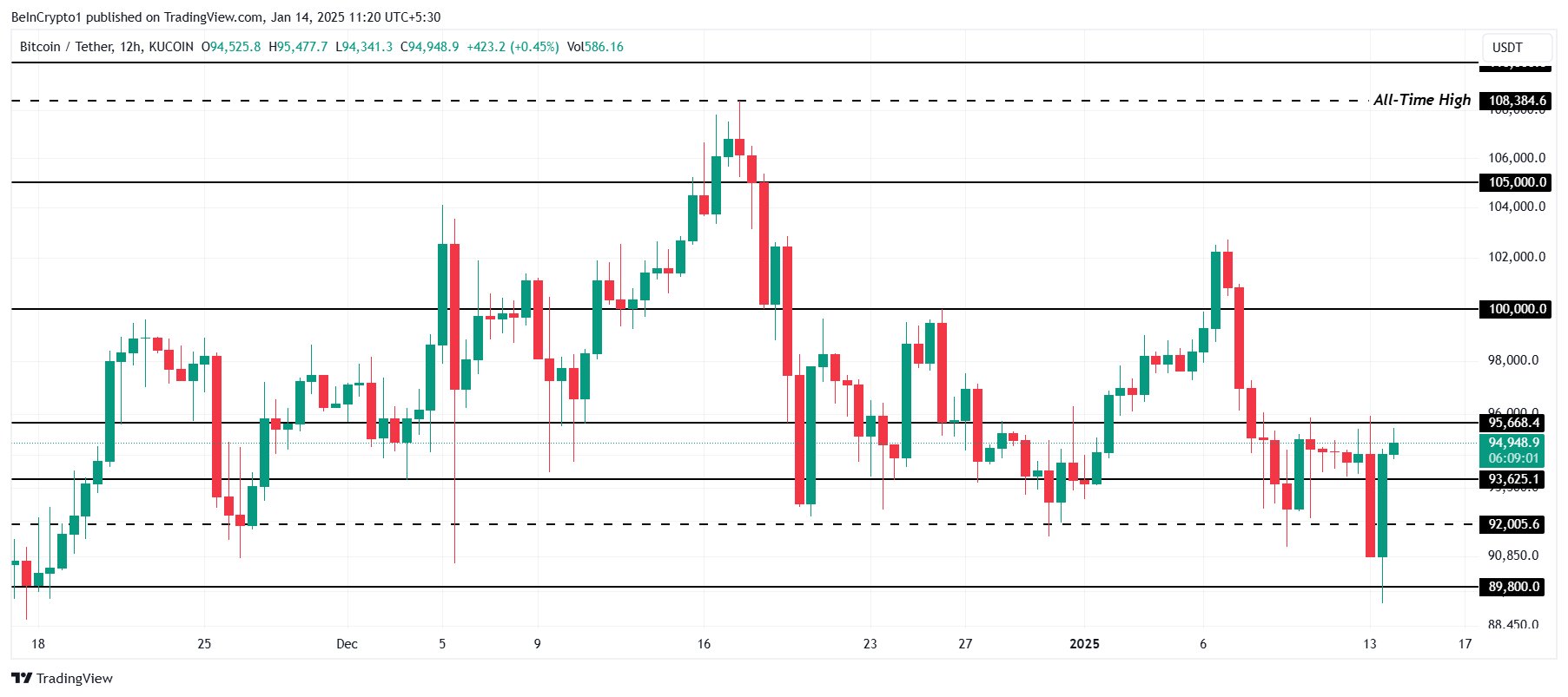 แม้ว่าการลดลงดูเหมือนจะไม่น่าเป็นไปได้ Bitcoin อาจประสบปัญหาในการทะลุ 95,668 USD ซึ่งอาจนำไปสู่การรวมตัวต่ำกว่าระดับแนวต้านนี้และสูงกว่าระดับสนับสนุนที่ 93,625 USD สถานการณ์เช่นนี้จะทำให้การฟื้นตัวล่าช้าและขยายรูปแบบการซื้อขายในช่วงปัจจุบัน