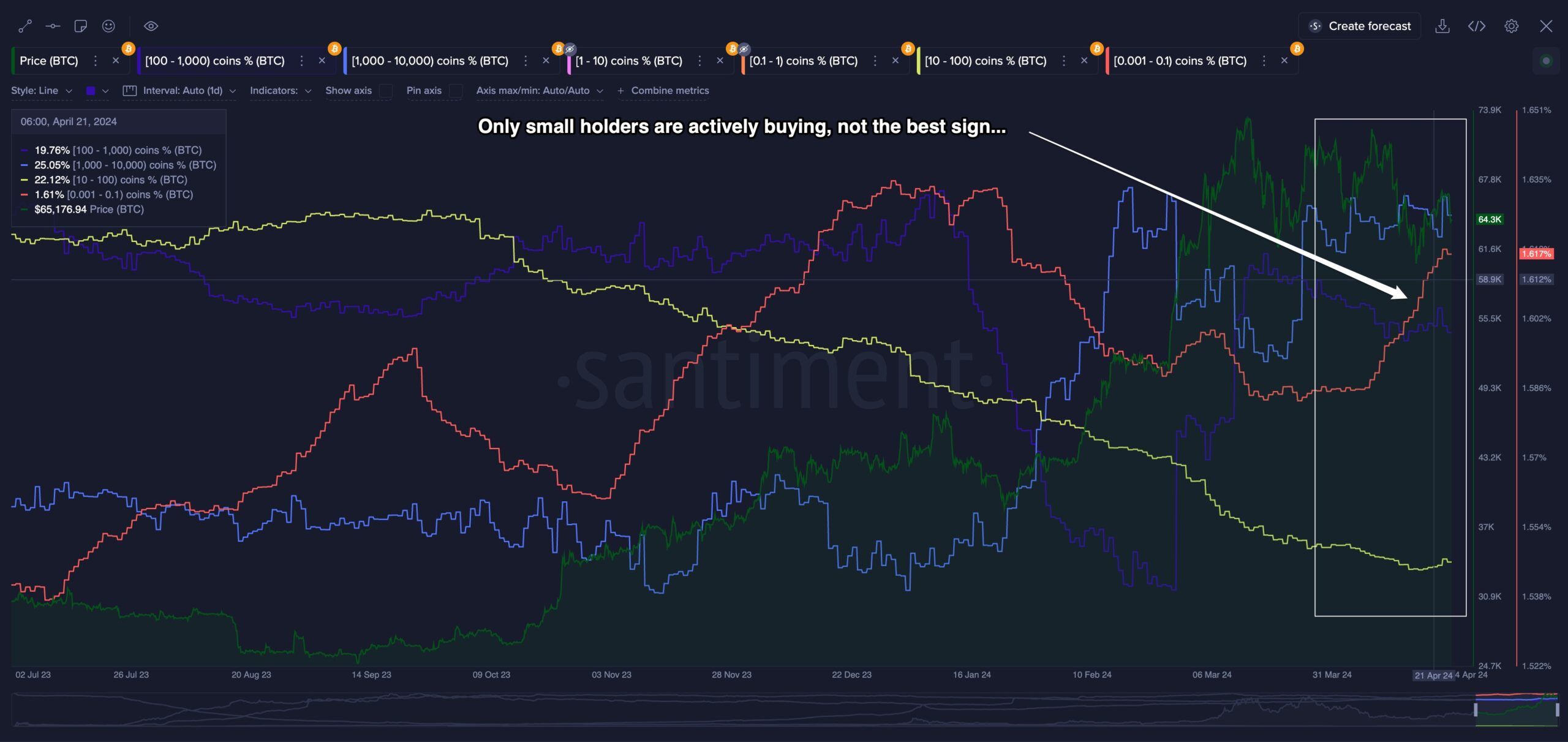 Balashevich ชี้ให้เห็นว่าสถานการณ์มีความซับซ้อนเมื่อพูดถึงการเปลี่ยนแปลงของตลาดในปัจจุบัน ในขณะที่ผู้ถือครองรายย่อยซื้ออย่างแข็งขัน แต่กลุ่มใหญ่กําลังทรงตัว ซึ่งบ่งชี้ถึงแนวทางที่ระมัดระวังในการคาดการณ์การปรับฐานของตลาด