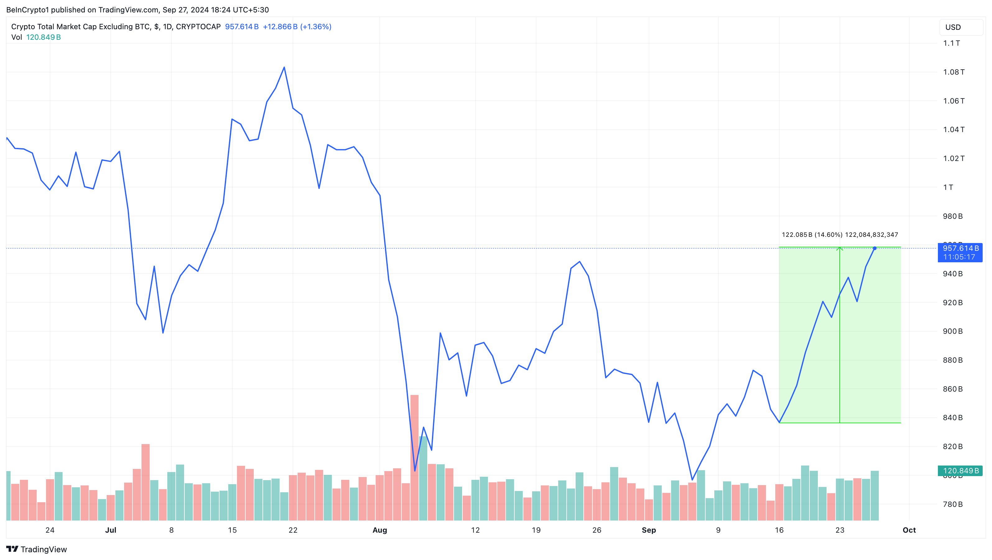 แม้ว่าความเป็นผู้นำของ Bitcoin จะลดลง แต่มูลค่าตลาดรวมของ altcoins ก็เพิ่มขึ้น 15% นับตั้งแต่วันที่ 17 กันยายน