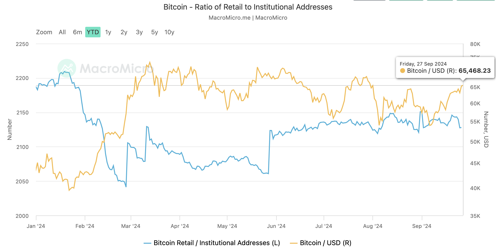 ตลอดปีนี้ นักลงทุนรายย่อยส่วนใหญ่ได้ยืนดูอยู่ข้างสนามในขณะที่นักลงทุนสถาบันผลักดันราคาของ BTC ให้สูงถึงจุดสูงสุดตลอดกาล (ATH) อย่างไรก็ตาม ณ เวลานี้ สถานการณ์ได้เปลี่ยนแปลงเนื่องจากจำนวนที่อยู่ของนักลงทุนรายย่อยเพิ่มขึ้นเมื่อเทียบกับนักลงทุนสถาบัน