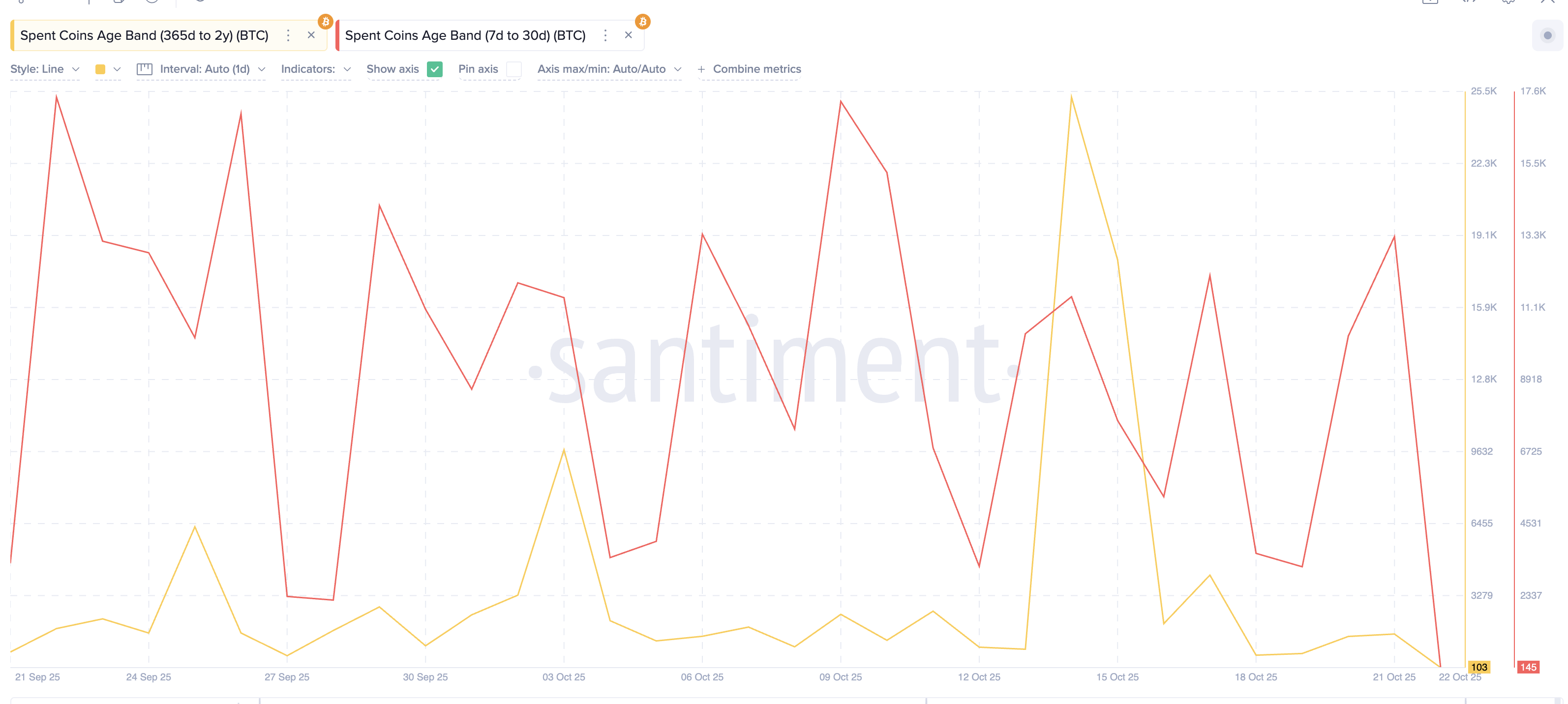 เหรียญที่ถือครองเป็นเวลา 365 วันถึง 2 ปี ลดลงจาก 25,263 เป็น 103 หน่วย BTC ที่ใช้จ่าย ลดลง 99.6% ระหว่างวันที่ 14 ถึง 22 ตุลาคม เหรียญระยะสั้น (7–30 วัน) ลดลงจาก 13,273 เป็น 145 ลดลง 98.9% ตั้งแต่เมื่อวาน