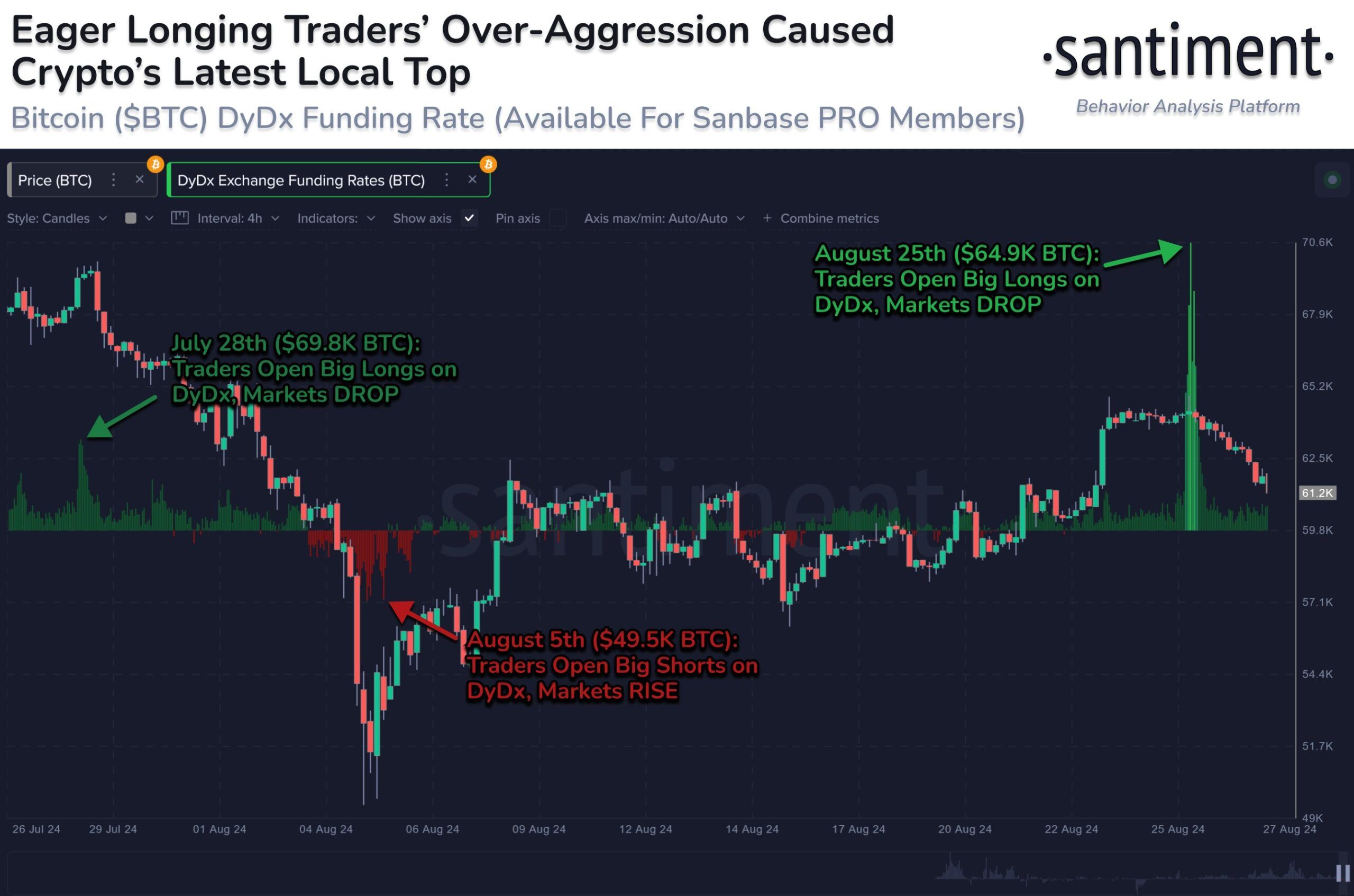 ราคาของ Bitcoin แตะพื้นต่ํากว่า แนวรับที่ 60,000 ดอลลาร์หลังจากที่ตลาดพลิกกลับเป็นขาขึ้นอย่างเปิดเผยเมื่อสัปดาห์ที่แล้ว จากข้อมูลของ Santiment BTC ตั้งข้อสังเกตว่ามีการเปิดสัญญาระยะยาวและหนักบน dYdX เมื่อวันที่ 25 สิงหาคม ซึ่งเป็นสัญญาณว่าผู้ค้าต้องการ/คาดหวังว่าจะมีราคาเพิ่มขึ้น