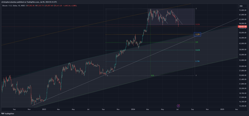 ในขณะเดียวกัน นักวิเคราะห์ Crypto Dave the Wave ได้ชี้ให้เห็นว่า Bitcoin ได้ทะลุระดับสนับสนุนสำคัญที่ 56,500 ดอลลาร์ เขาได้ชี้ว่าระดับ Fibonacci ที่สำคัญถัดไป อยู่ที่ประมาณ 48,000 ดอลลาร์ ซึ่งอาจให้การสนับสนุนที่จำเป็น