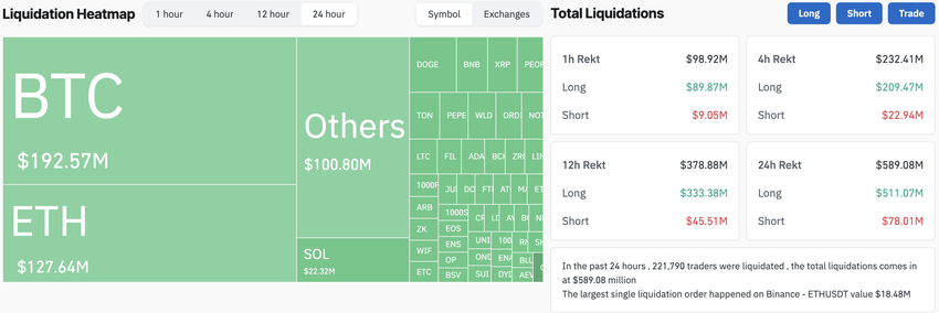 ความผันผวนของ Bitcoin และตลาดคริปโตโดยรวมได้ทำให้เกิดการชำระเงินลงทุนจำนวนมาก รวมทั้งสิ้น 589 ล้านดอลลาร์ ซึ่งรวมถึงเงินลงทุนระยะยาวมากกว่า 511 ล้านดอลลาร์ และเงินลงทุนระยะสั้น 78 ล้านดอลลาร์ โดยเฉพาะอย่างยิ่ง ในชั่วโมงที่ผ่านมามีการชำระเงินลงทุนเกือบ 100 ล้านดอลลาร์