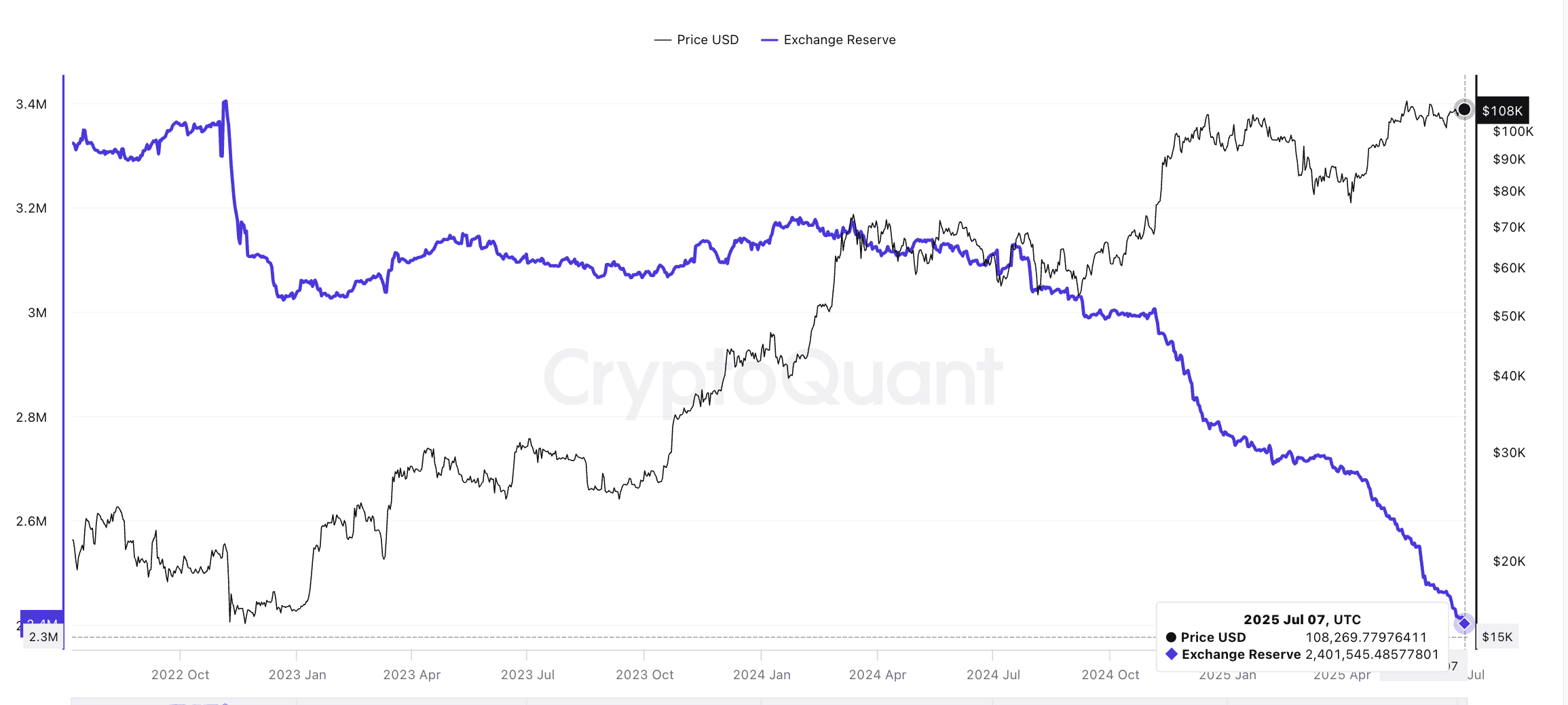 ตัวบ่งชี้ที่ชัดเจนที่สุดในขณะนี้คือการที่สำรอง Bitcoin บนแพลตฟอร์มแลกเปลี่ยนลดลงอย่างรวดเร็ว ณ วันที่ 7 กรกฎาคม มีเพียง 2.4 ล้าน BTC ที่เหลืออยู่บนแพลตฟอร์มแบบรวมศูนย์ ซึ่งเป็นระดับต่ำสุดในรอบกว่าสามปี ในประวัติศาสตร์ การลดลงของสำรองบ่งชี้ว่านักลงทุนกำลังดึง coin ของพวกเขาไปยัง cold wallet ลดปริมาณที่พร้อมขาย