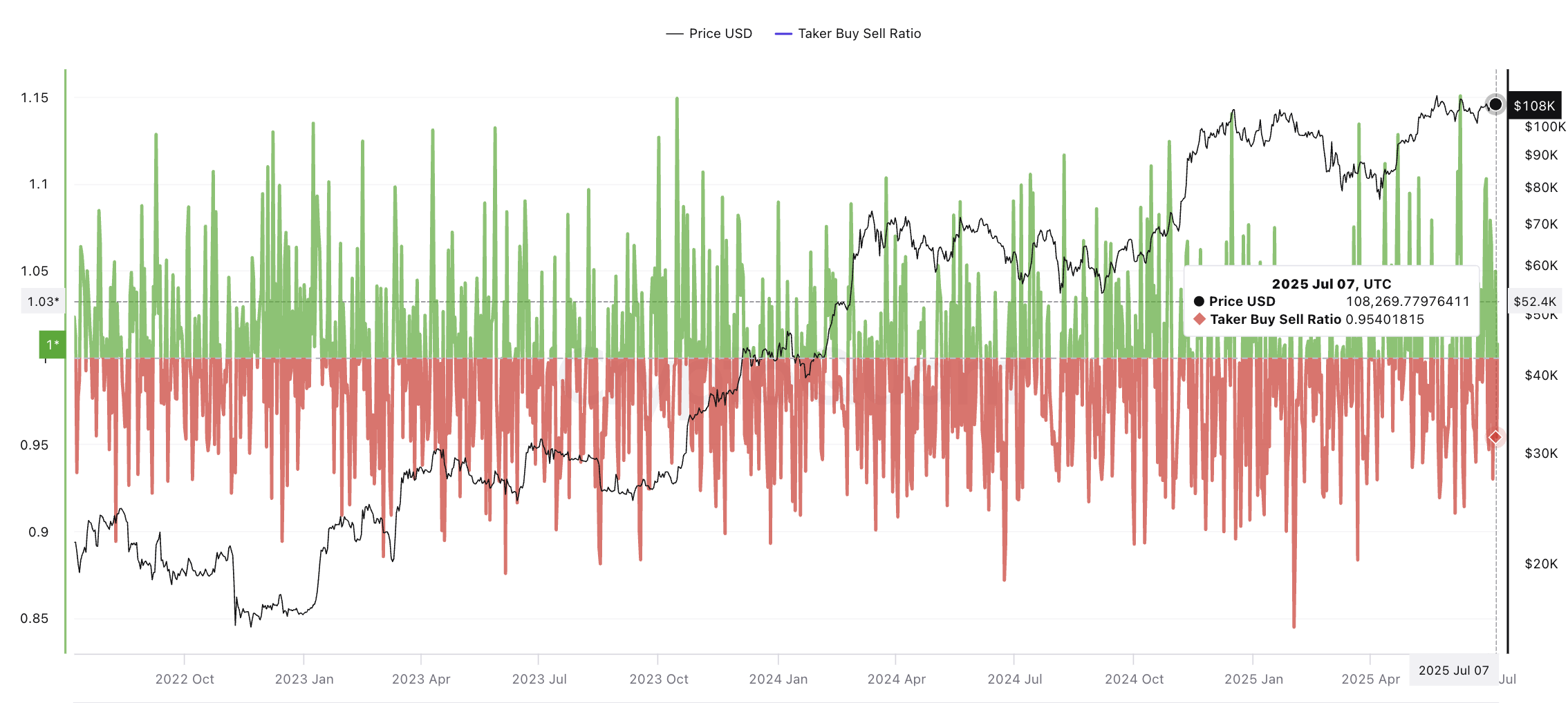 เมื่ออัตราส่วนนี้พลิกกลับไปที่มากกว่า 1 มักจะบ่งชี้ว่าผู้ซื้อ BTC กำลังก้าวเข้ามาด้วยความมั่นใจ ทุกครั้งที่เกิดขึ้นในช่วงหกเดือนที่ผ่านมา มันได้กระตุ้นการวิ่งขึ้นระยะสั้น หากเราเห็นอัตราส่วนนี้เพิ่มขึ้นในอีกไม่กี่วันข้างหน้า อาจเป็นแรงผลักดันสุดท้ายที่จำเป็นในการทะลุผ่านกำแพง 110,000 USD