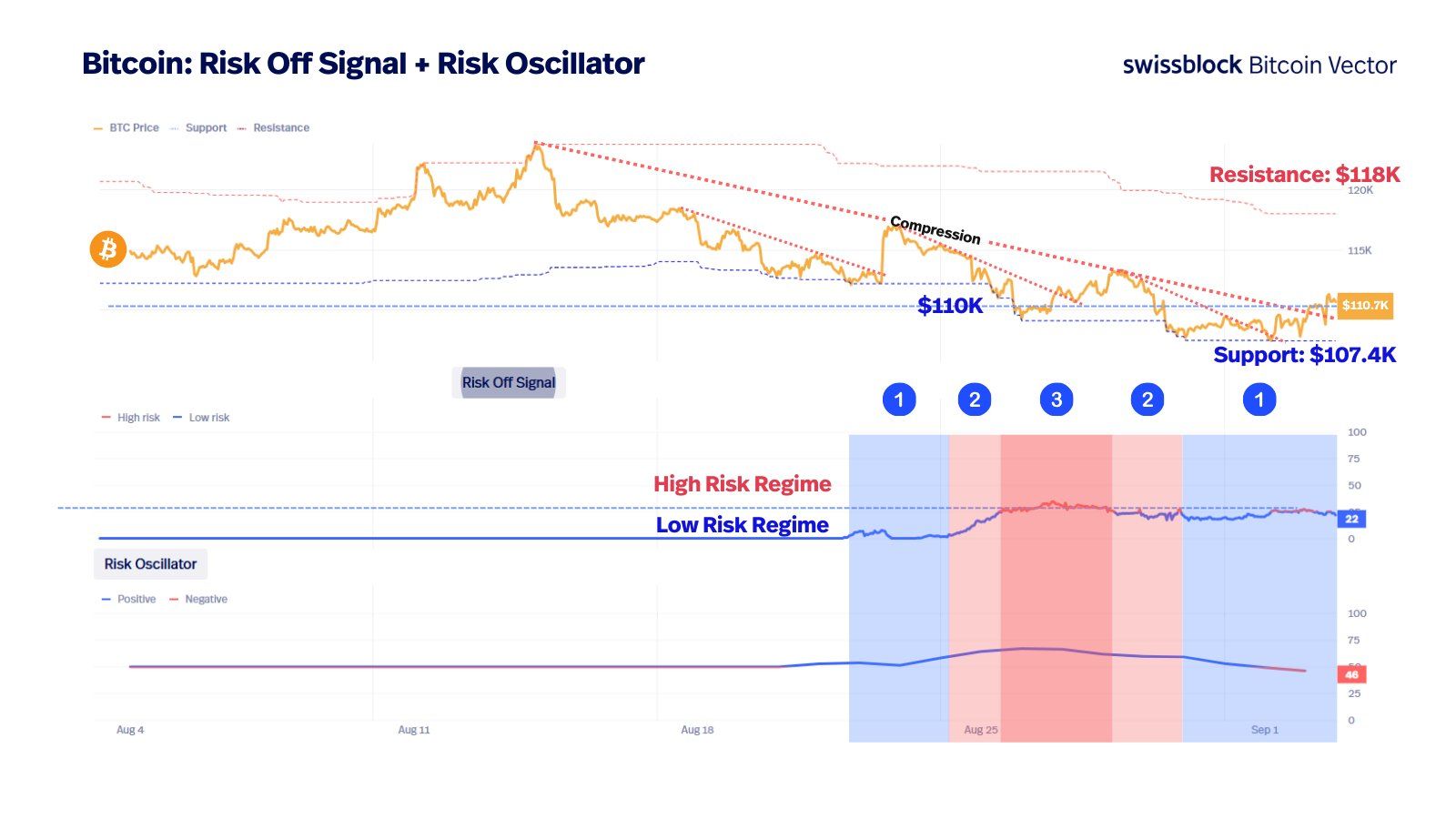 สัญญาณความเสี่ยงในตลาด Bitcoin กำลังลดลง ตามข้อมูลจาก Bitcoin Vector สัญญาณ Risk-Off กำลังถอยกลับไปสู่ระบอบความเสี่ยงต่ำ การเปลี่ยนแปลงนี้บ่งบอกว่าสภาพตลาดกำลังมีเสถียรภาพหลังจากความผันผวนหลายสัปดาห์