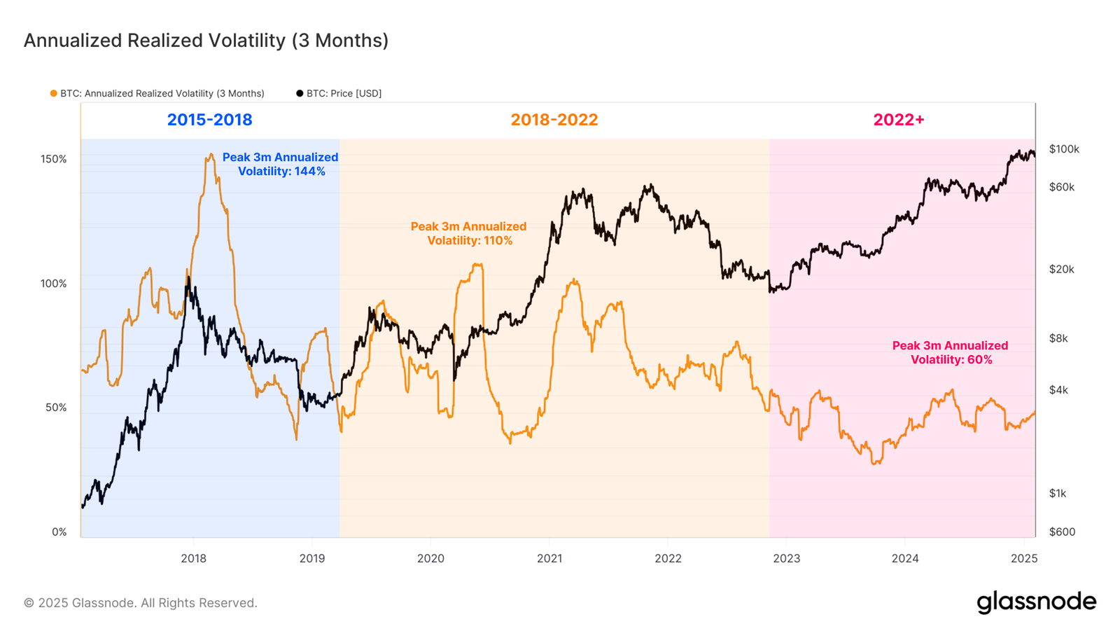 ความผันผวนที่เกิดขึ้นจริงในหน้าต่างสามเดือนยังคงต่ำกว่า 50% ในรอบนี้ ในทางตรงกันข้าม การขึ้นราคาครั้งก่อนๆ มีระดับความผันผวนเกิน 80% ถึง 100% การลดลงของความผันผวนนี้บ่งชี้ว่าการเคลื่อนไหวของราคาบิทคอยน์มีโครงสร้างมากขึ้น โดยนักลงทุนที่มีประสบการณ์มีส่วนช่วยให้ตลาดมีความมั่นคงมากขึ้น