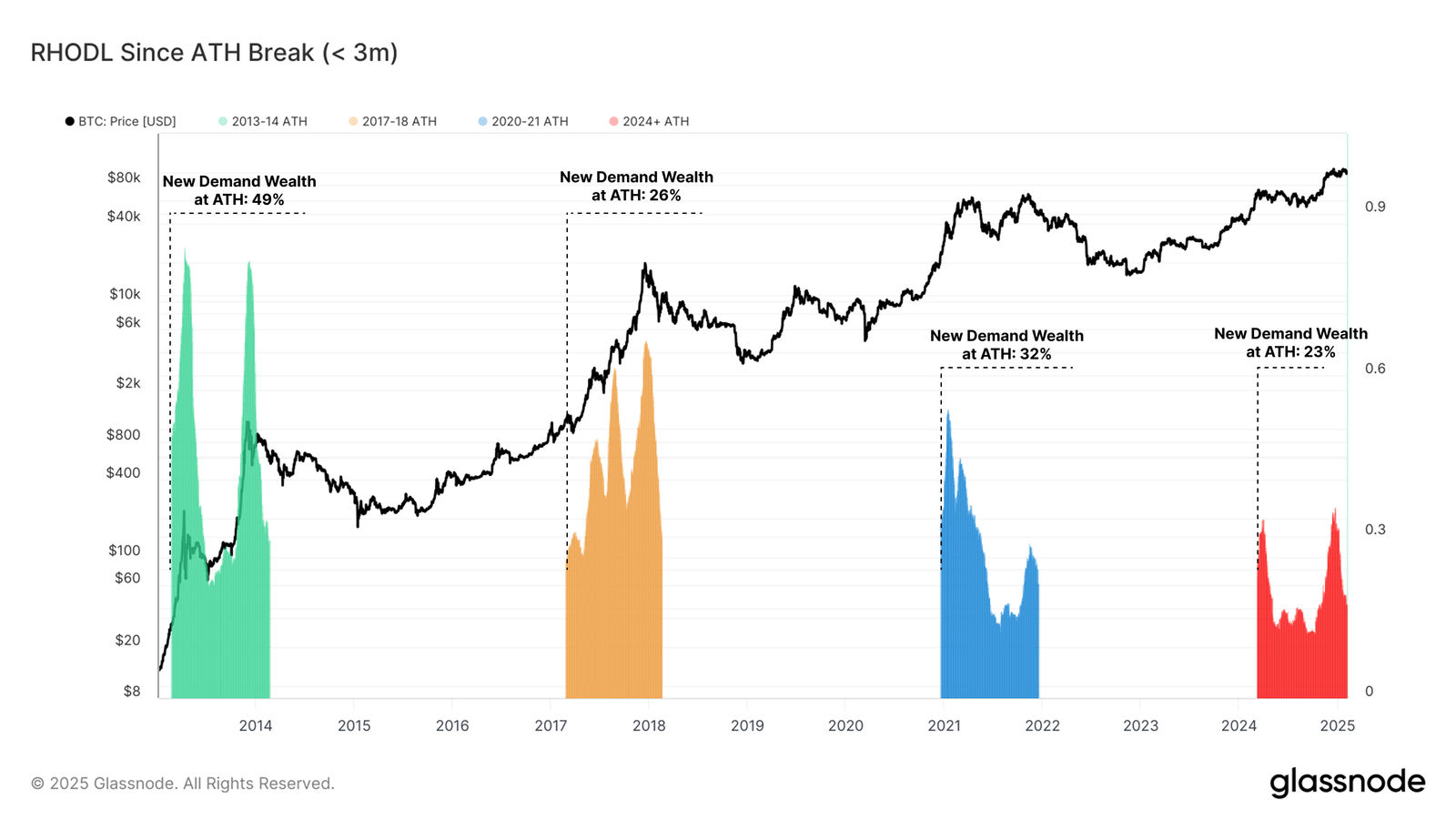 อัตราส่วน RHODL (Realized HODL) ตั้งแต่บิทคอยน์ทำจุดสูงสุดใหม่ (ATH) ล่าสุดอยู่ที่ 23% แม้ว่าความต้องการใหม่ยังคงมีความสำคัญในรอบนี้ แต่ความมั่งคั่งที่ถือครองใน coin ที่มีอายุมากกว่าสามเดือนนั้นต่ำกว่ารอบก่อนๆ ซึ่งบ่งชี้ว่าการไหลเข้าของความต้องการใหม่เกิดขึ้นเป็นช่วงๆ แทนที่จะเป็นรูปแบบที่ต่อเนื่อง