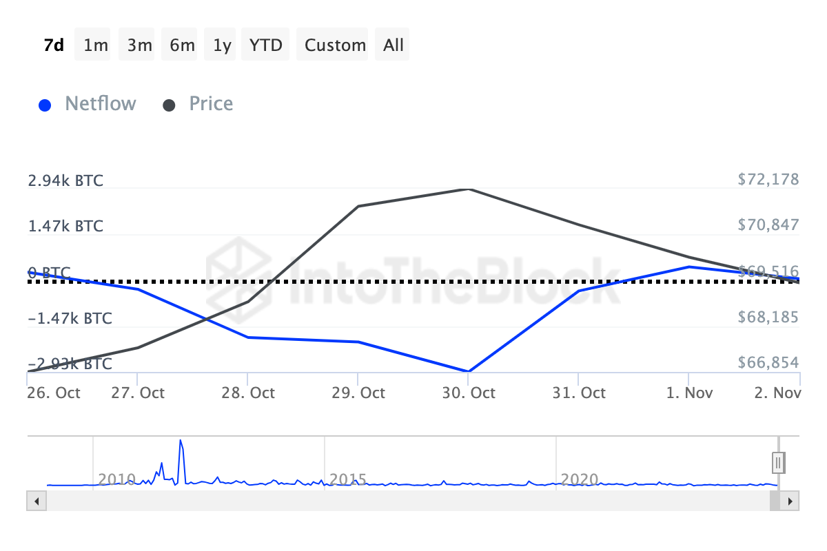 เมื่อการไหลเข้าและออกของผู้ถือหุ้นใหญ่เป็นบวก วาฬคริปโตกำลังสะสม และราคาสามารถเพิ่มขึ้นได้ อย่างไรก็ตาม ตามข้อมูลจาก IntoTheBlock การไหลเข้าและออกลดลง หมายความว่าวาฬได้ขายเหรียญมากกว่าที่ซื้อในช่วงเจ็ดวันที่ผ่านมา
