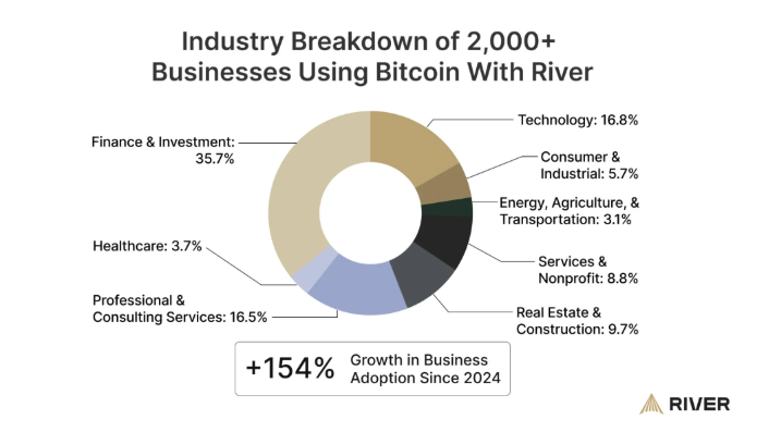 ในทำนองเดียวกัน สถิติของ River แสดงให้เห็นว่าการถือครอง Bitcoin ของธุรกิจเพิ่มขึ้น 154% ตั้งแต่ปี 2024 โดยมี บริษัทกว่า 2,000 แห่งที่ใช้แพลตฟอร์ม River เพื่อสะสม BTC