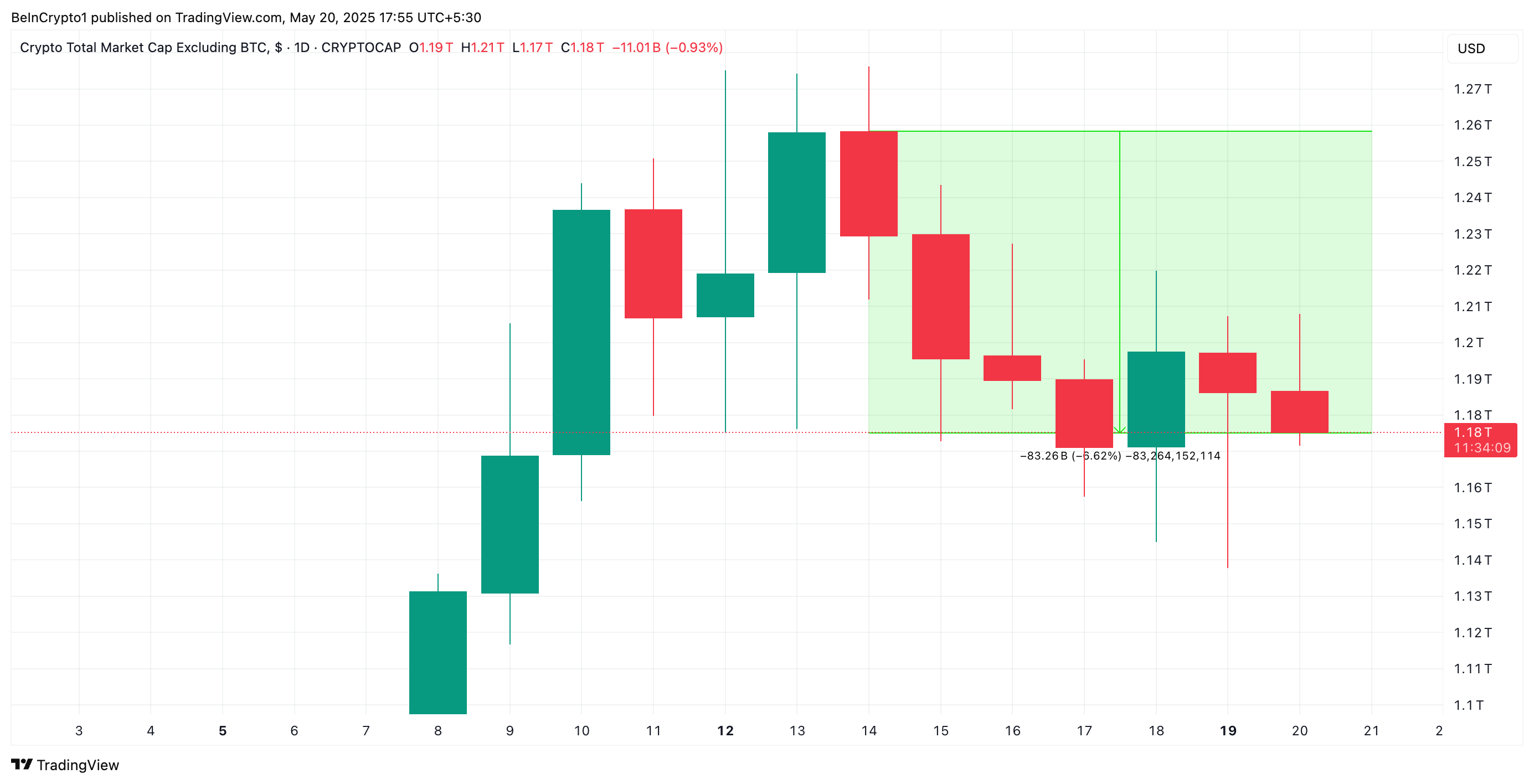น่าสนใจที่ตั้งแต่วันที่ 14 พฤษภาคม TOTAL2 ซึ่งวัดมูลค่าตลาดรวมของสกุลเงินดิจิทัลทั้งหมดที่ไม่รวม BTC มีแนวโน้มลดลง ปัจจุบันอยู่ที่ 1.18 ล้านล้าน USD ลดลง 83 พันล้าน USD ในสัปดาห์ที่ผ่านมา