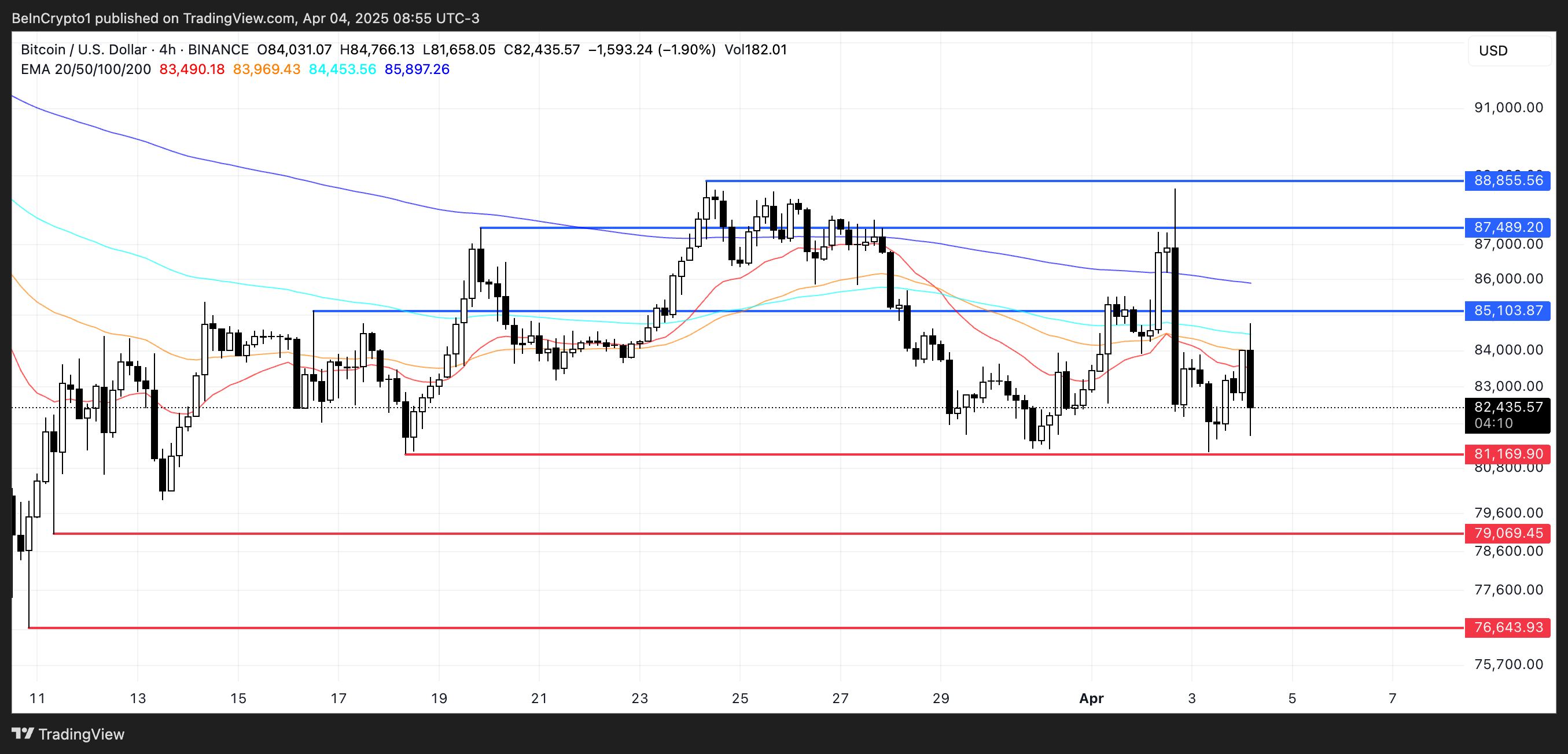 เมื่อ สงครามการค้าระหว่างจีนและสหรัฐฯ ทวีความรุนแรงขึ้น การลดลงต่ำกว่าระดับนี้อาจทำให้ BTC ตกลงต่ำกว่าระดับจิตวิทยาที่ 80,000 USD โดยมีเป้าหมายถัดไปอยู่ที่ประมาณ 79,069 USD หากโซนนี้สูญเสียไปด้วย แนวโน้มขาลงอาจทวีความรุนแรงขึ้น ส่งผลให้ BTC ลดลงต่อไปสู่ 76,643 USD