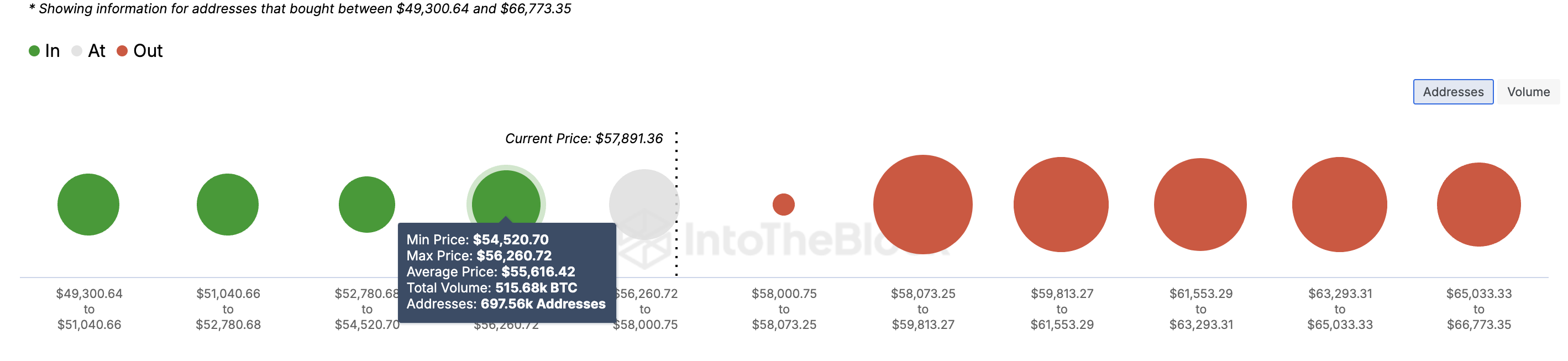 ตามข้อมูลจาก IntoTheBlock จำนวนที่อยู่ที่ซื้อ Bitcoin ระหว่าง 58,073 และ 66,773 USD มากกว่าผู้ที่ซื้อระหว่าง 49,300 และ 56,200 USD นี้บ่งชี้ว่า Bitcoin อาจเผชิญกับการต้านทานที่แข็งแกร่งในราคาที่สูงขึ้น หากแรงซื้อไม่เพิ่มขึ้น ระดับราคาที่เป็นไปได้ต่อไปสำหรับ BTC อาจอยู่ที่ประมาณ 54,520 USD.
