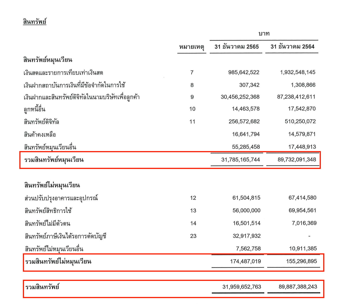 อีกประเด็นที่น่าสนใจอย่างยิ่งคือปริมาณสินทรัพย์ของบริษัท Bitkub กล่าวคือ สินทรัพย์หมุนเวียนในปี 2565 นั้นน้อยกว่า 2564 ถึงราว 5.7 หมื่นล้านบาท อย่างไรก็ตาม สำหรับสินทรัพย์ไม่หมุนเวียน ปี 2565 มีมากกว่าราว 19 ล้านบาท