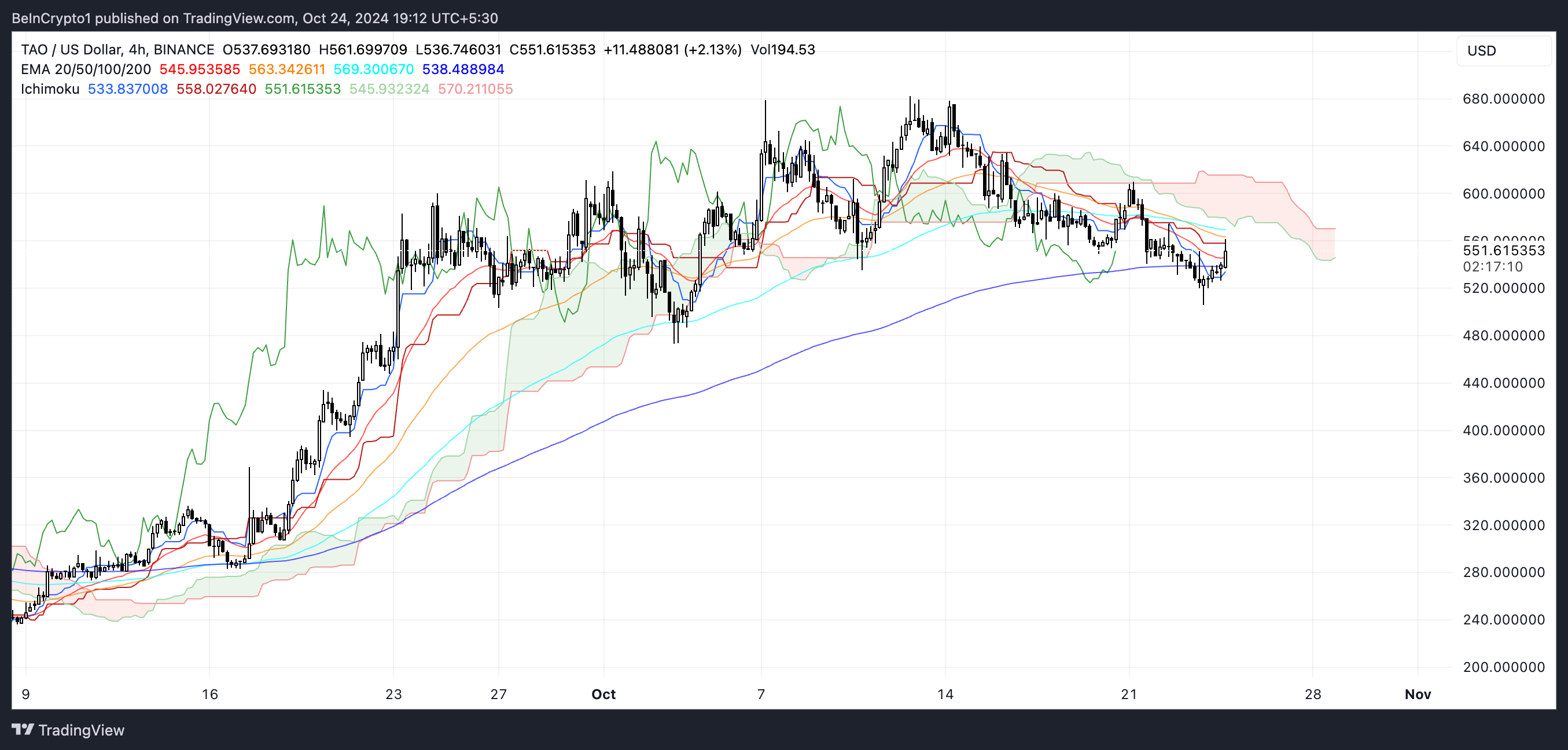 แผนภูมิ Ichimoku Cloud สำหรับ TAO แสดงภาพผสมผสานของสภาพตลาดปัจจุบัน ราคากำลังซื้อขายใกล้กับเมฆ ซึ่งบ่งชี้ถึงความไม่แน่นอน