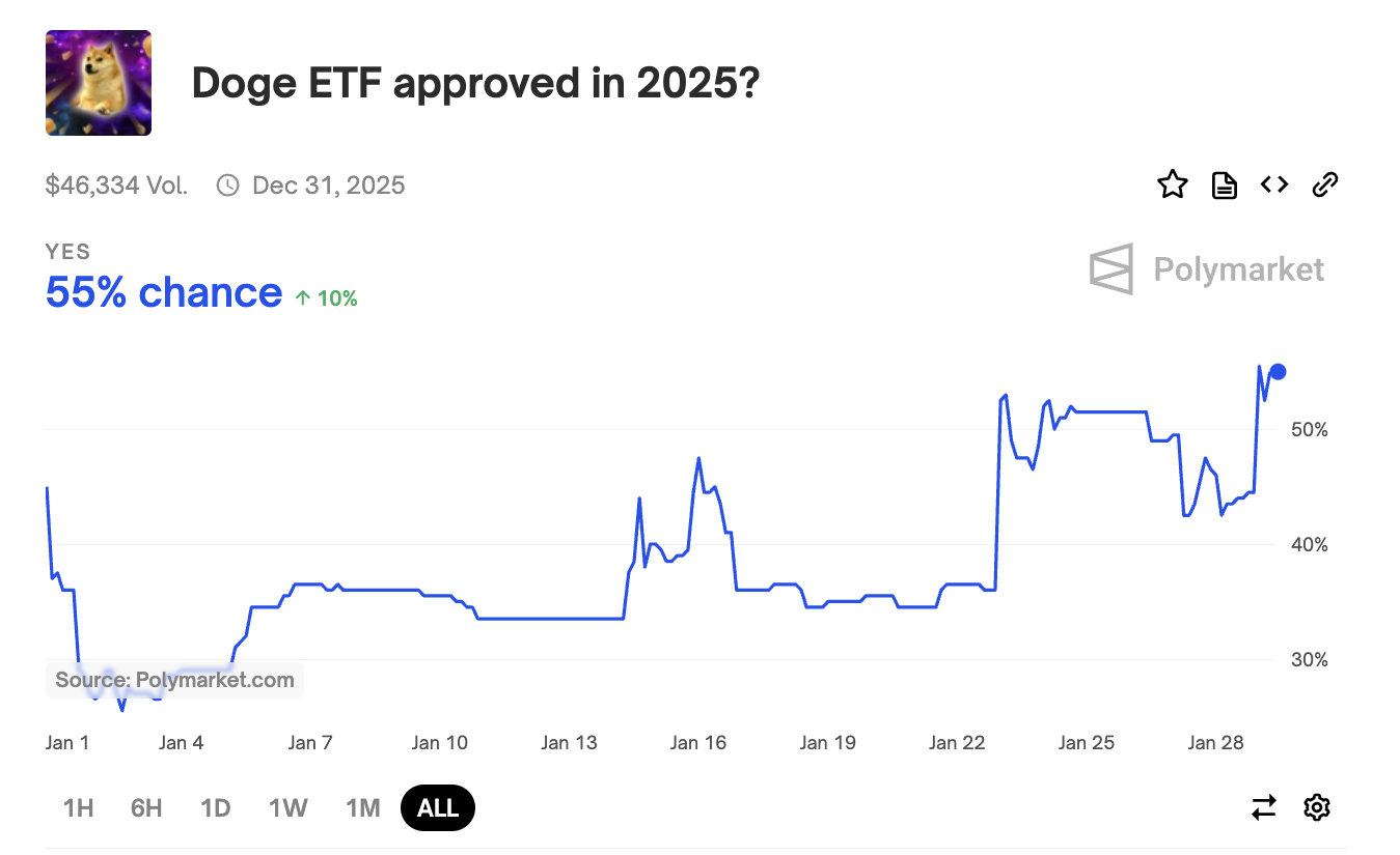 ในขณะเดียวกัน หลังจากการยื่น Dogecoin ETF ของ Bitwise อัตราต่อรองการเดิมพัน บนแพลตฟอร์มการทำนาย Polymarket พุ่งสูงขึ้นถึงระดับสูงสุดเป็นประวัติการณ์ที่ 56% ในการอนุมัติ ขณะที่เขียน อัตราต่อรองยังคงอยู่ที่ 55%