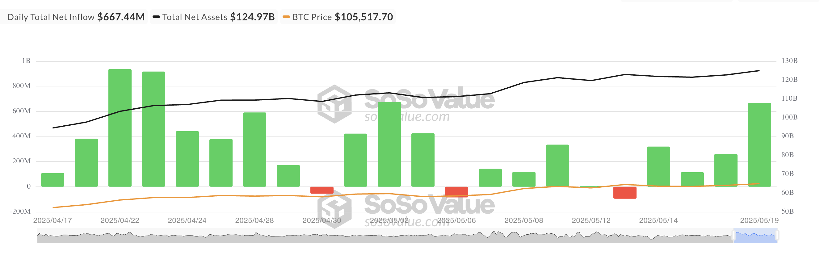 เมื่อวานนี้ กองทุน BTC แบบสปอตที่จดทะเบียนในสหรัฐฯ บันทึกการไหลเข้ารวมสุทธิกว่า 667.44 ล้าน USD ซึ่งเป็นการไหลเข้าวันเดียวที่สูงที่สุดตั้งแต่วันที่ 2 พฤษภาคม นอกจากนี้ยังเป็นวันที่สี่ติดต่อกันที่มีการไหลเข้าบวกในกองทุนเหล่านี้ สะท้อนถึงความต้องการของสถาบันที่เพิ่มขึ้นท่ามกลางสัญญาณการฟื้นตัวของตลาดที่กว้างขึ้น