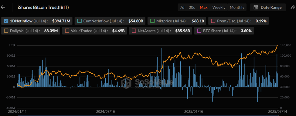 ณ วันที่ 14 กรกฎาคม สินทรัพย์สุทธิของ IBIT อยู่ที่ 85.96 พันล้าน USD หลังจากการไหลเข้าที่เป็นบวกทุกวันทำการตั้งแต่วันที่ 9 มิถุนายน