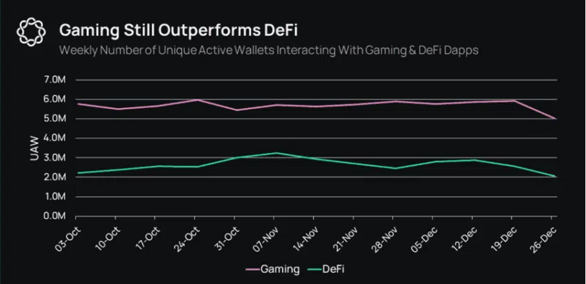 แม้ว่า DeFi จะอยู่ในช่วงขาลง แต่วงการเกมบล็อกเชนกลับค่อย ๆ ไต่ระดับสู่ระยะขาขึ้น ซึ่งคิดเป็น UAW เฉลี่ย 1.15 ล้านต่อวัน