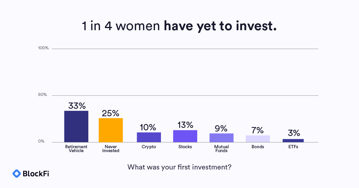 การสำรวจที่จัดทำโดย BlockFi แสดงให้เห็นว่าผู้หญิงเจเนอเรชั่น Z และคนรุ่นมิลเลนเนียลที่ยังใหม่ต่อการลงทุนยินดีที่จะนำเงินของพวกเขาไปลงทุนใน crypto ก่อนสิ่งอื่นใด ผลสำรวจพบว่า 10% ของผู้หญิงเลือก crypto เป็นการลงทุนครั้งแรก