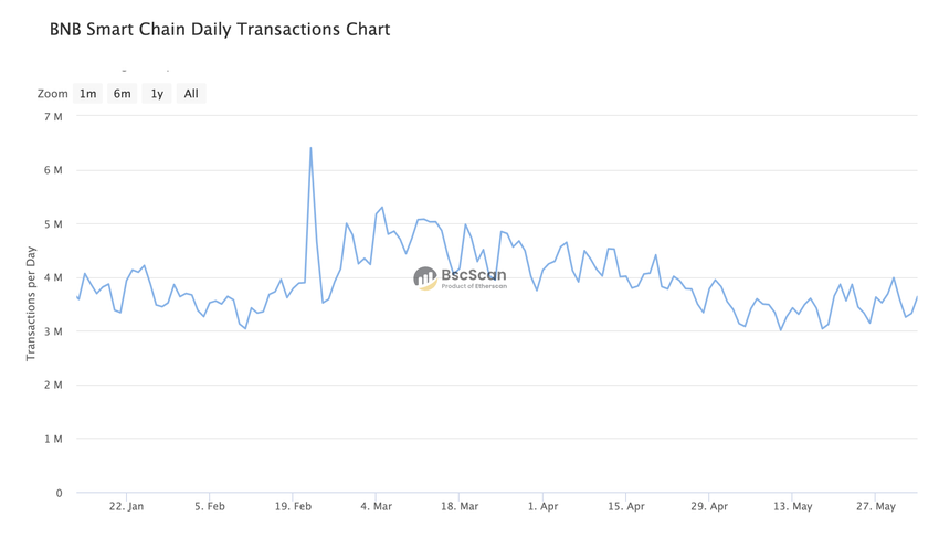 ธุรกรรมรายวันบน Binance Smart Chain แสดงรูปแบบที่มั่นคงและจากน้อยไปมาก โดยเพิ่มขึ้นจากประมาณ 3 ล้านเป็น 4 ล้านธุรกรรมต่อวัน การเพิ่มขึ้นอย่างต่อเนื่องนี้บ่งบอกถึงกิจกรรมที่สม่ำเสมอและการใช้งาน Binance Smart Chain ที่เพิ่มขึ้น