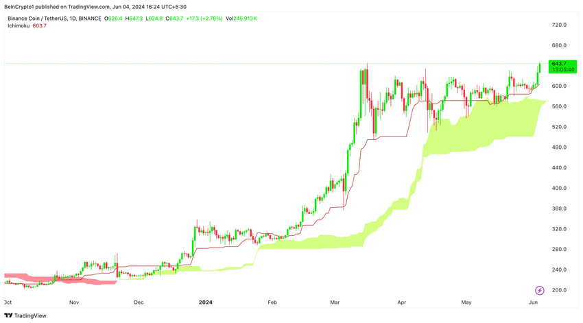 ในกราฟรายวัน ราคาของ BNB พบแนวรับที่แข็งแกร่งที่เส้นฐานของเมฆ Ichimoku รายวัน สีแดง ราคายังคงอยู่เหนือเส้นนี้มานานกว่าหนึ่งเดือนโดยเน้นย้ําถึงความสําคัญของการตรวจสอบตัวบ่งชี้ทางเทคนิคนี้
